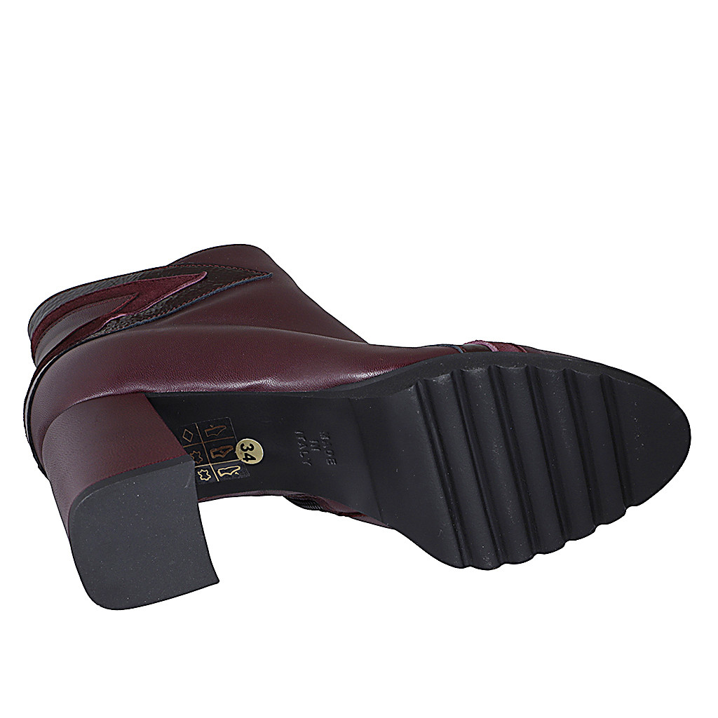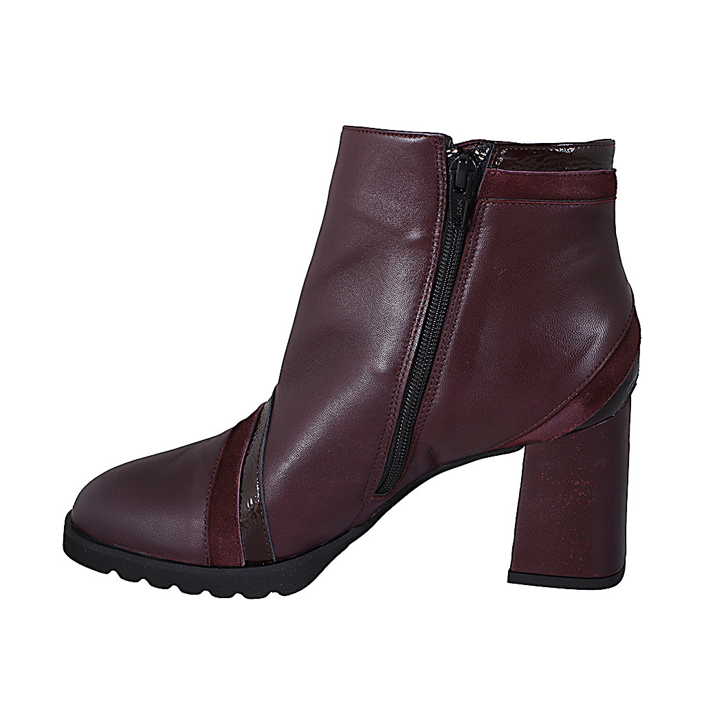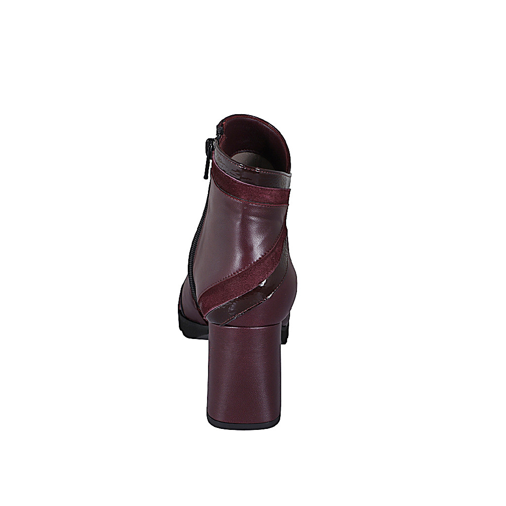 Bottines pour femmes avec fermeture éclair en cuir, daim et cuir verni bordeaux talon 7