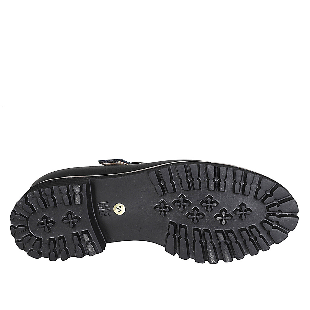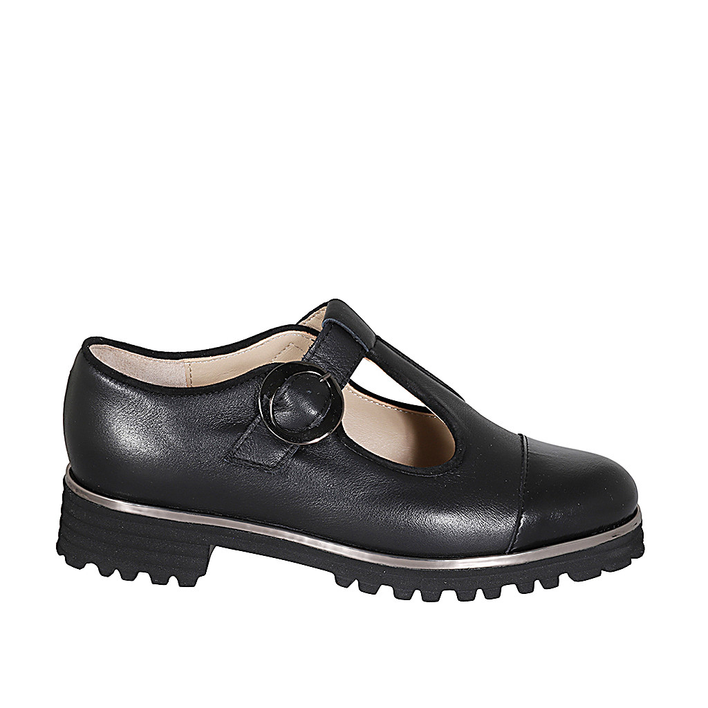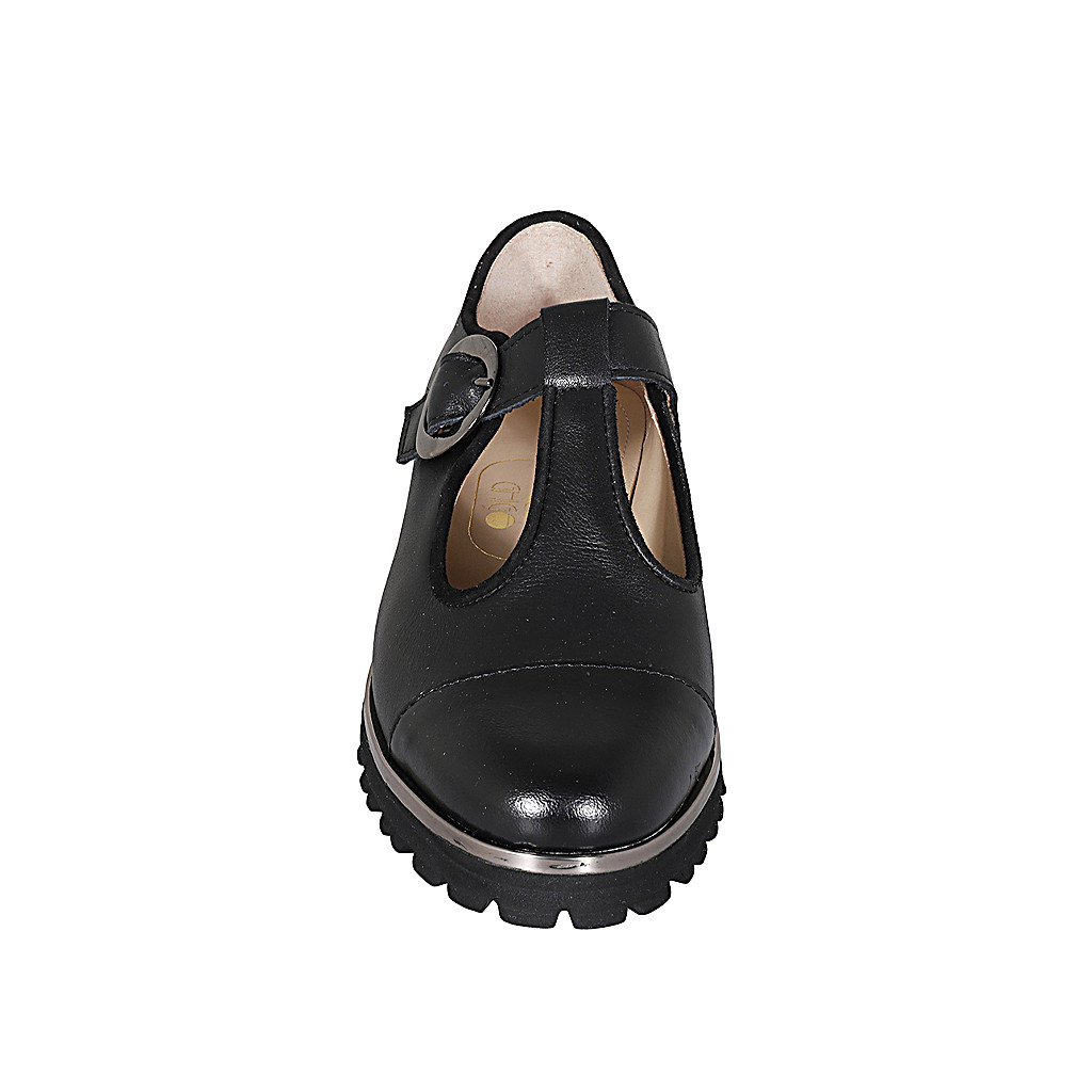 Chaussure fermée pour femmes avec courroie en T avec boucle et bout droit en cuir noir talon 3 - Pointures disponibles:  33
