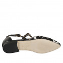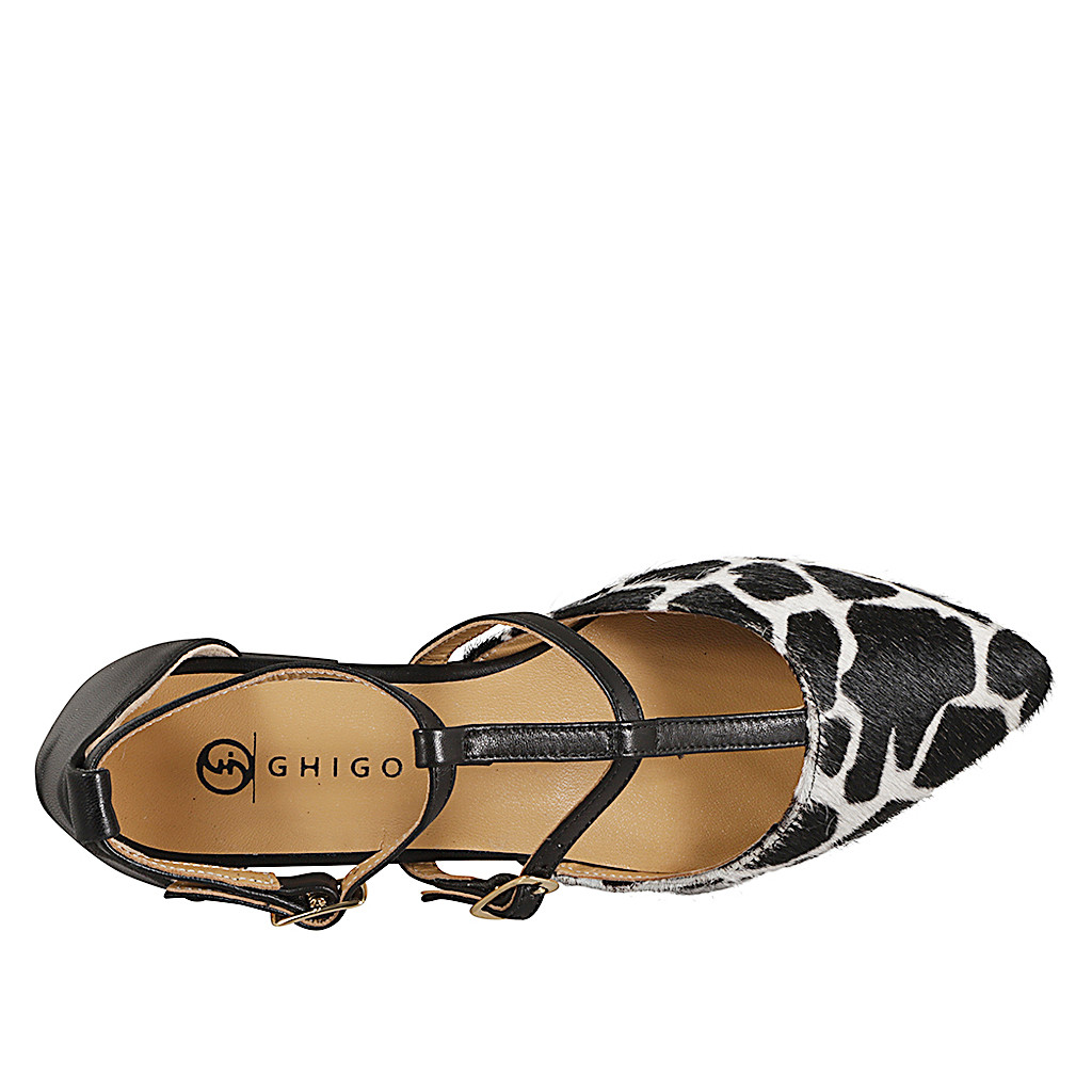 Chaussure ouverte pour femmes à bout pointu avec courroies en cuir noir et veau avec fourrure tachetée blanc et noir, talon 2