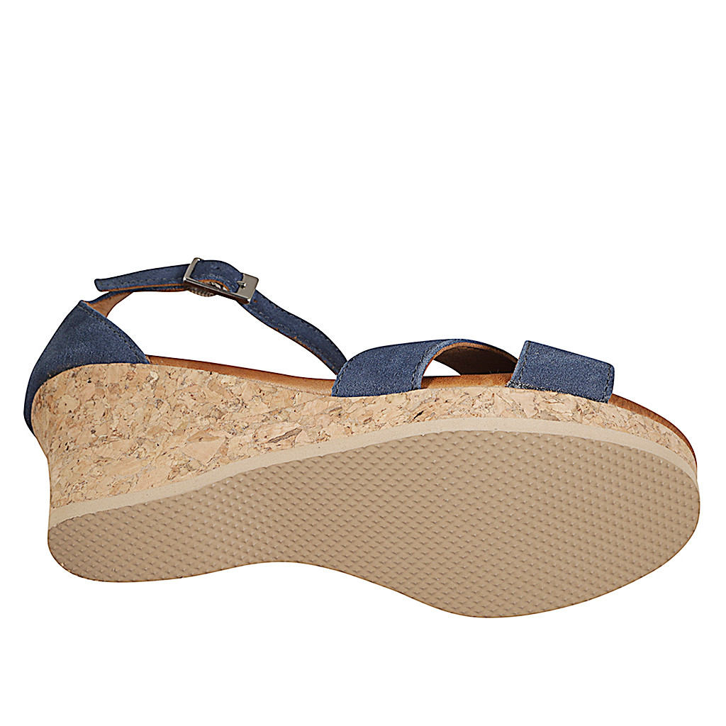 Chaussure ouverte pour femmes avec courroie lanières croisée et plateforme en daim bleu talon compensé 7