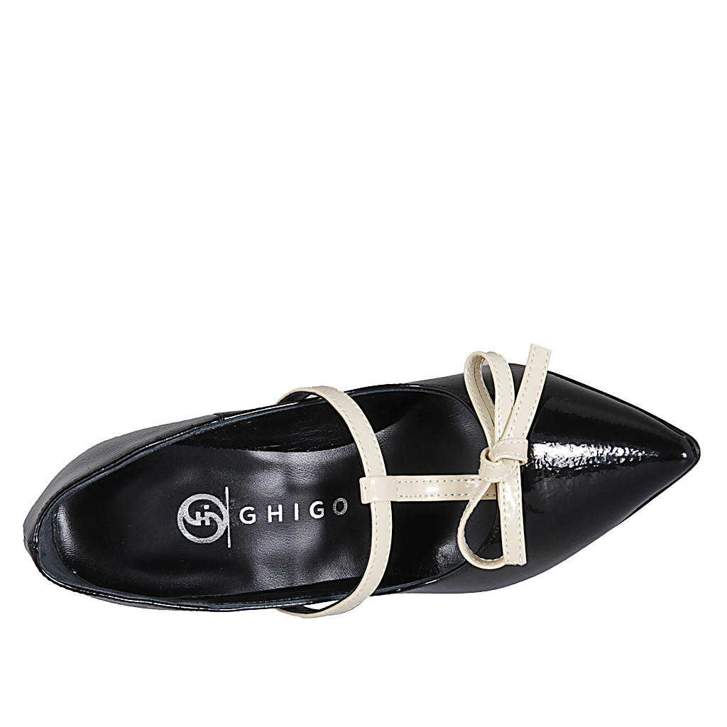 Escarpin pour femmes avec courroie et noeud en cuir verni noir et cuir beige talon 10 - Pointures disponibles:  31, 32, 33, 34, 35, 42, 43, 44, 45