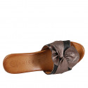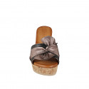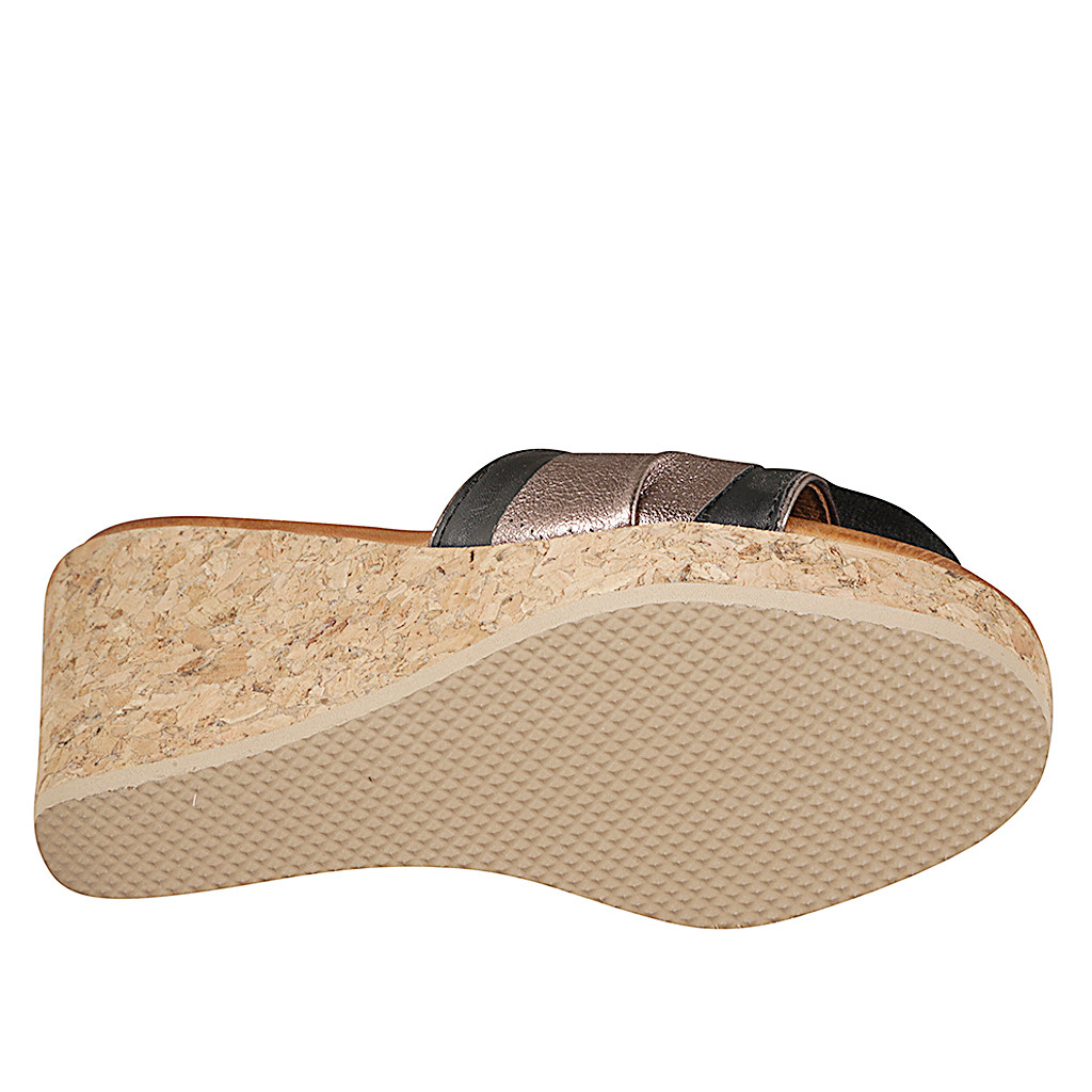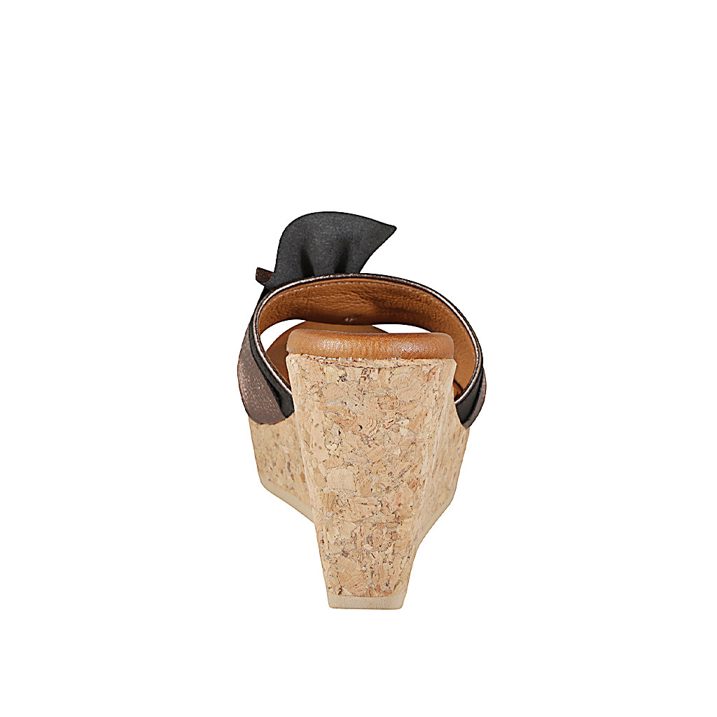 Mules pour femmes en cuir noir et nœud en daim imprimé bronze et liège talon compensé 9