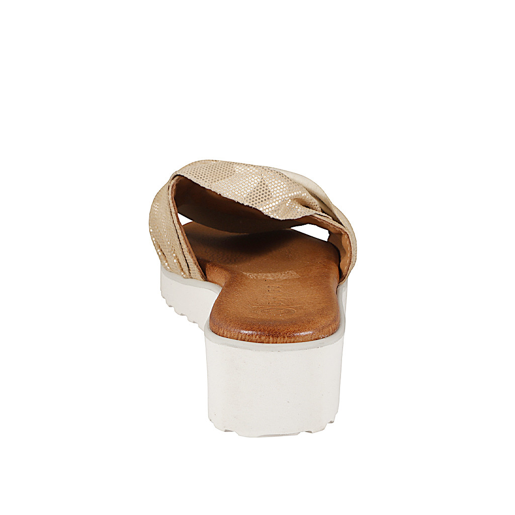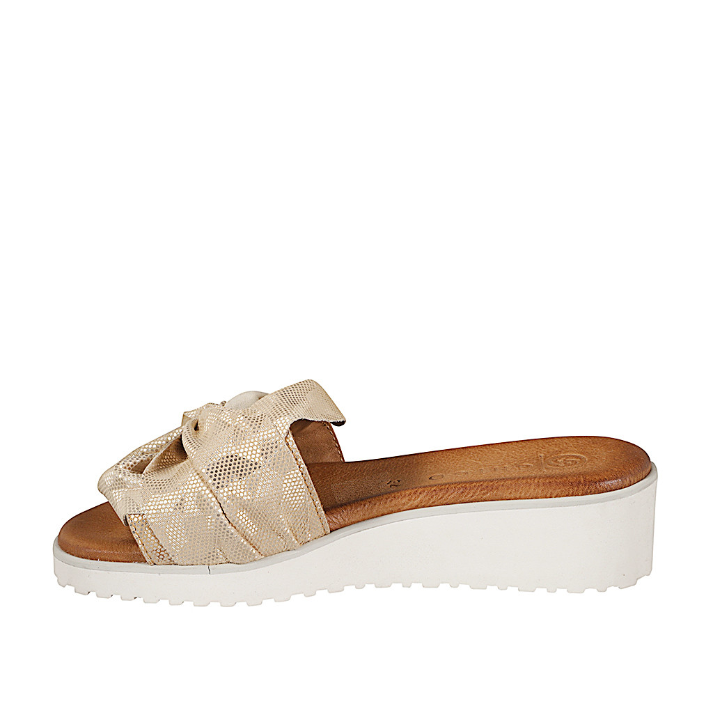 Mules pour femmes en daim beige avec platine imprimée et avec nœud, talon compensé 4