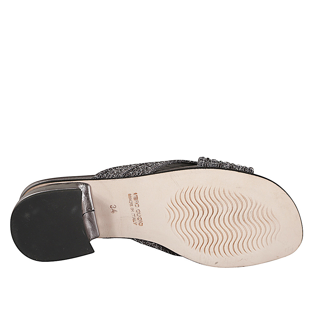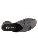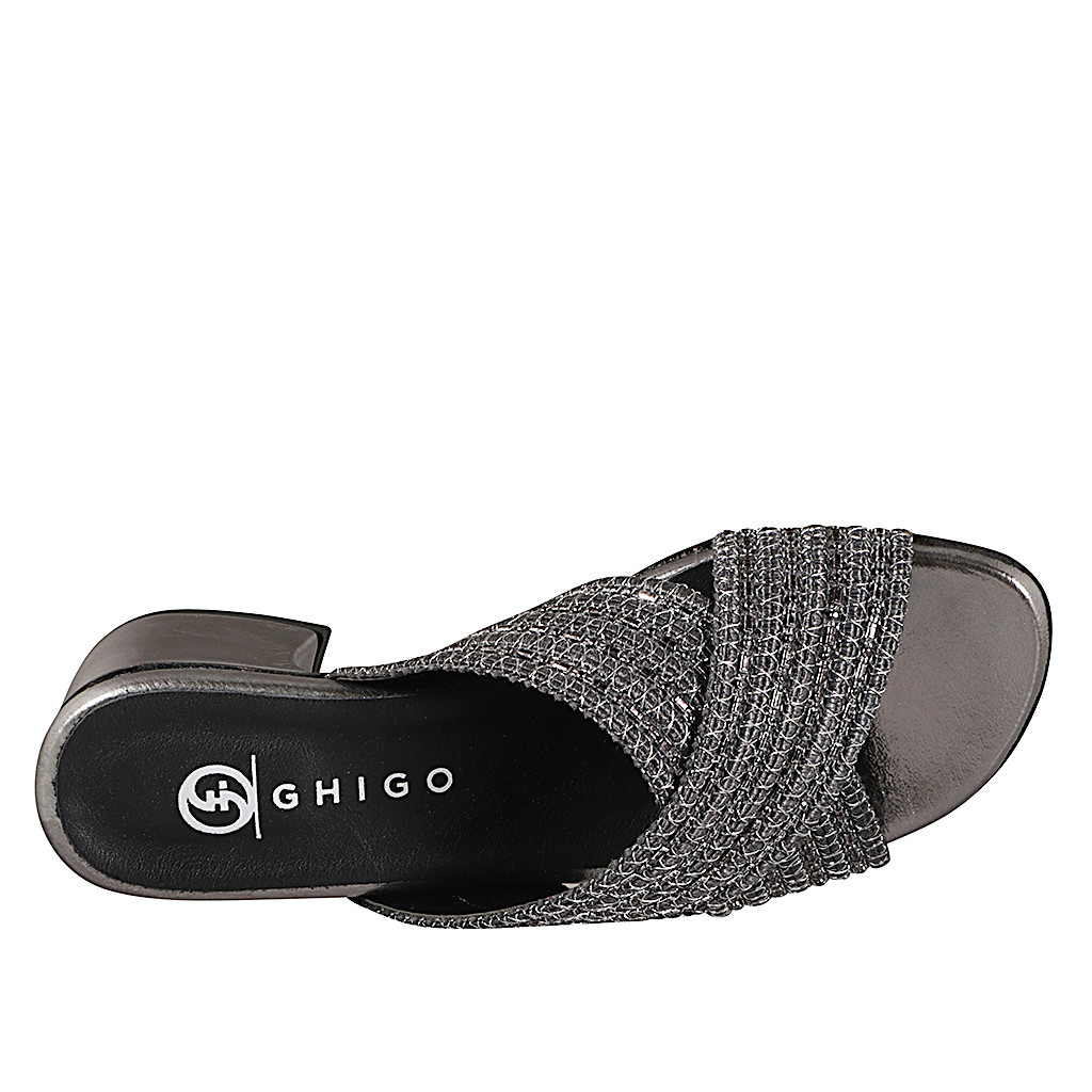 Mule pour femmes avec bandes croisées en tissu gris avec insertions et perles argent, talon 4