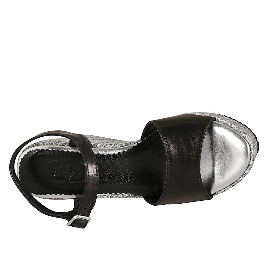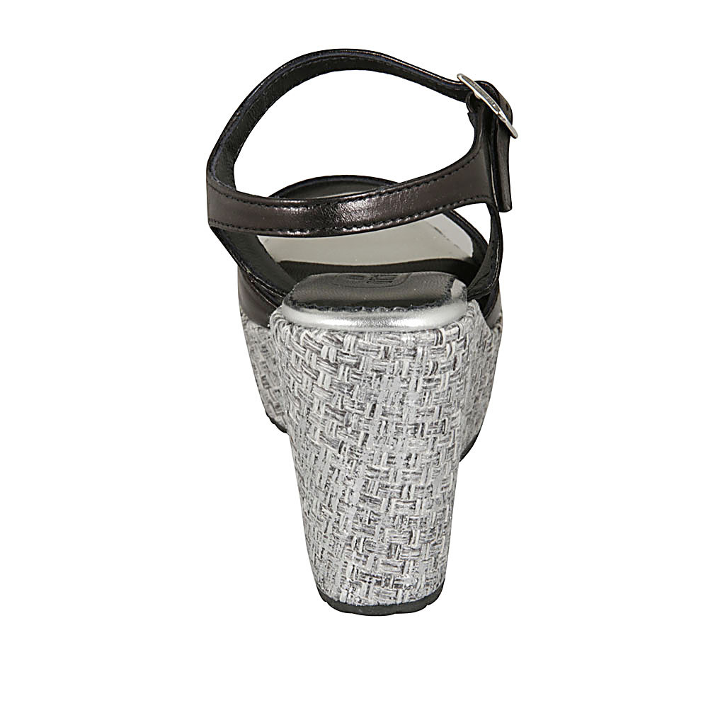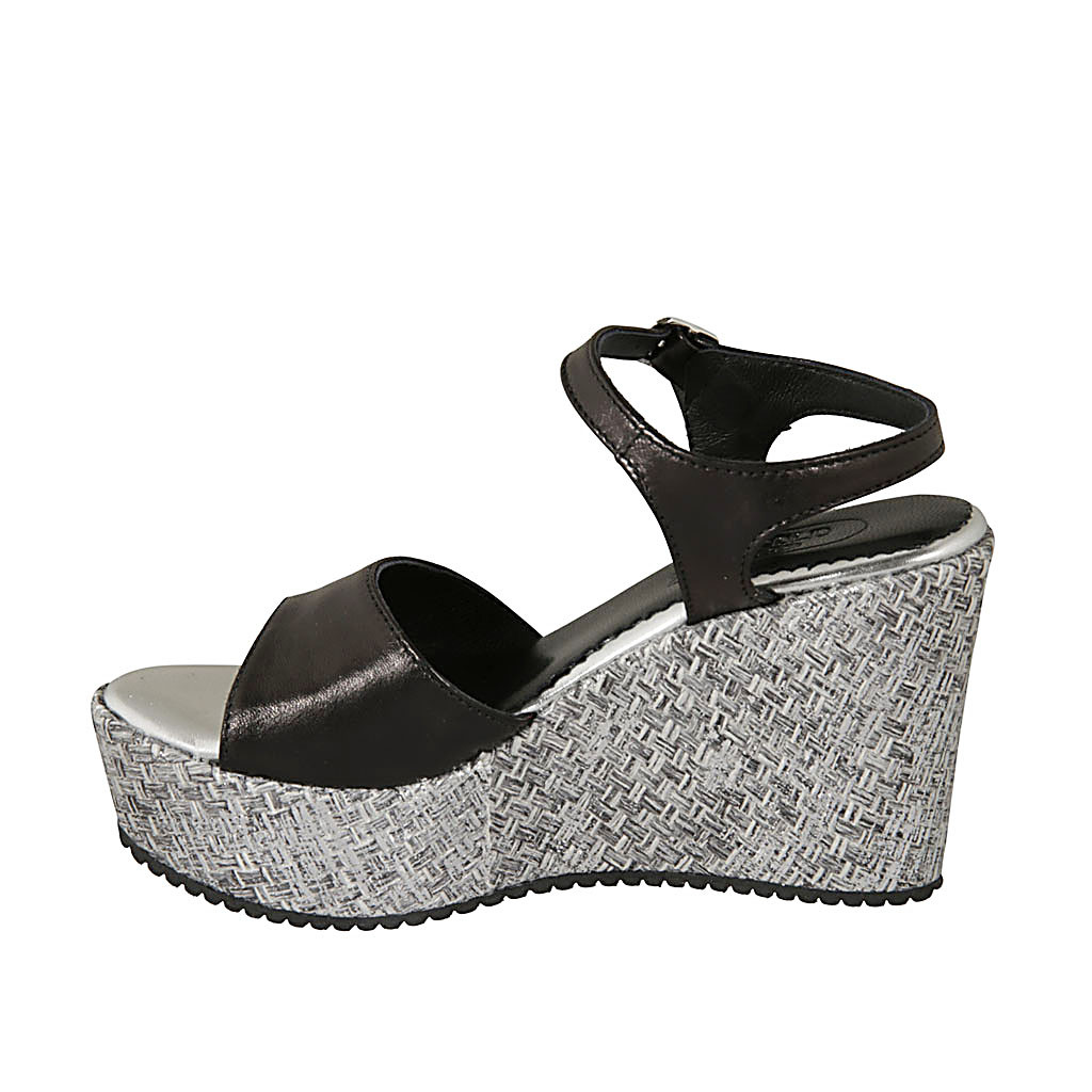 Sandale pour femmes avec courroie et plateforme en cuir noir et tissu gris argent talon compensé 9
