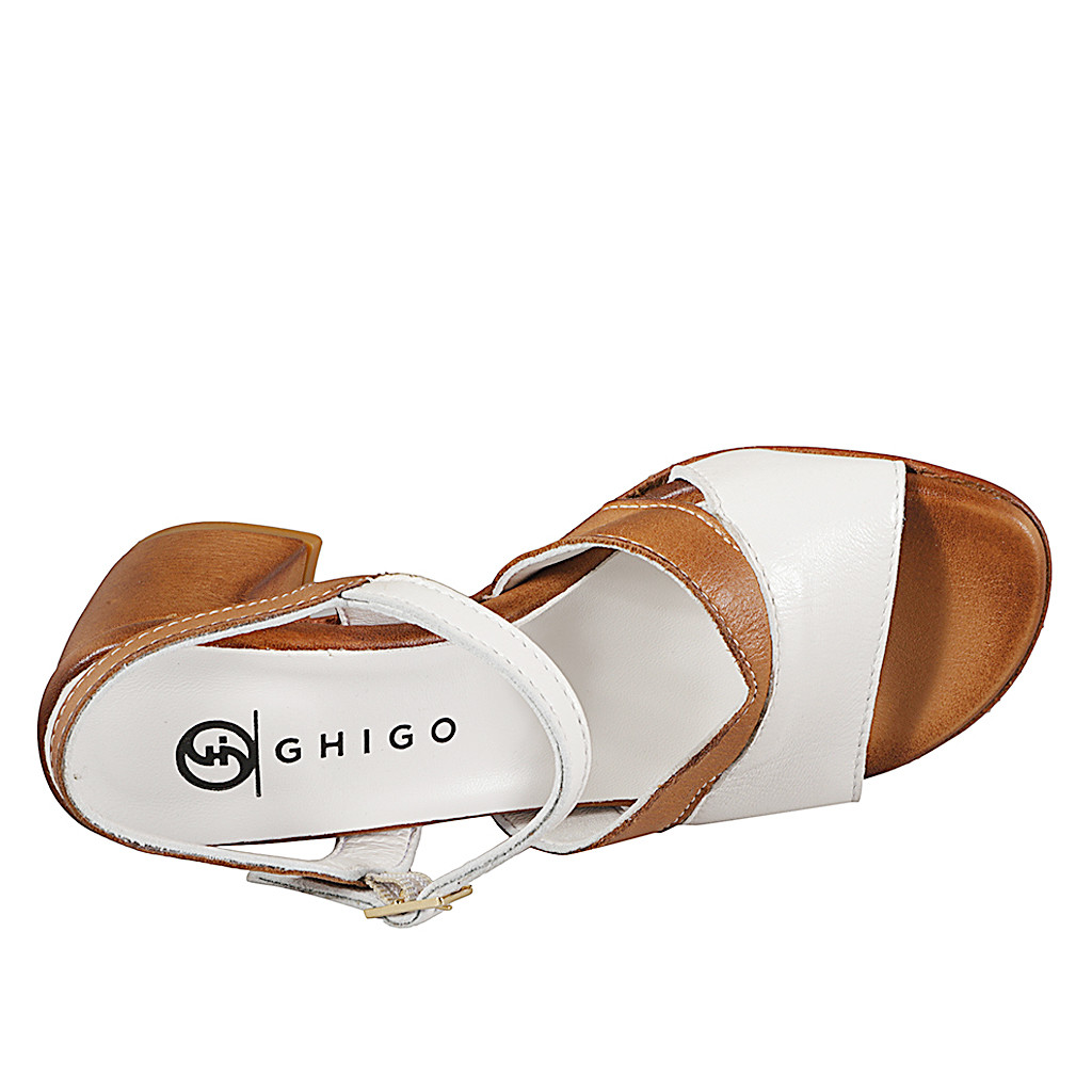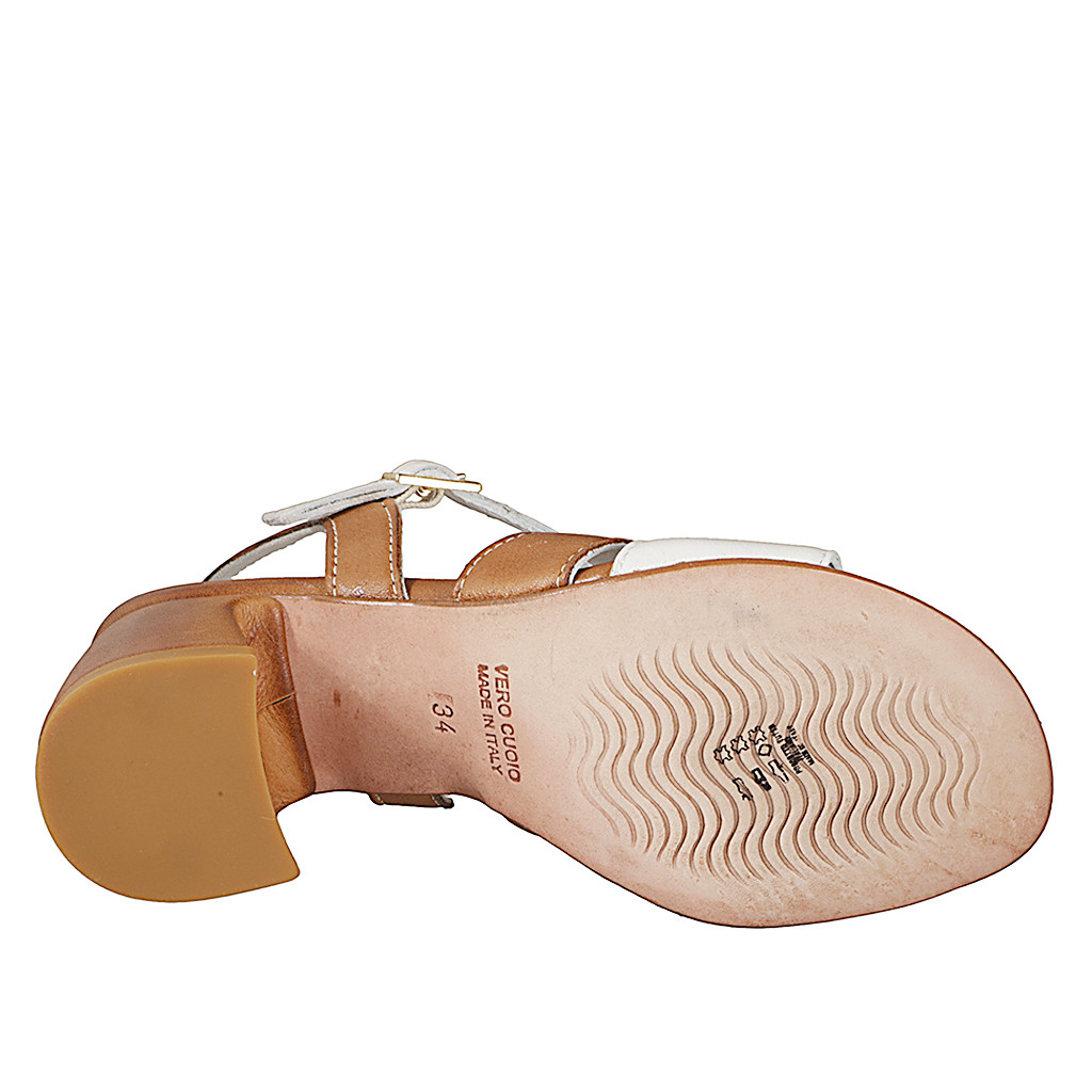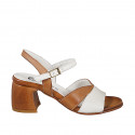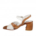 Sandales pour femmes avec courroie à la cheville en cuir blanc et cuir cognac talon 6