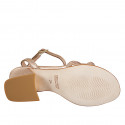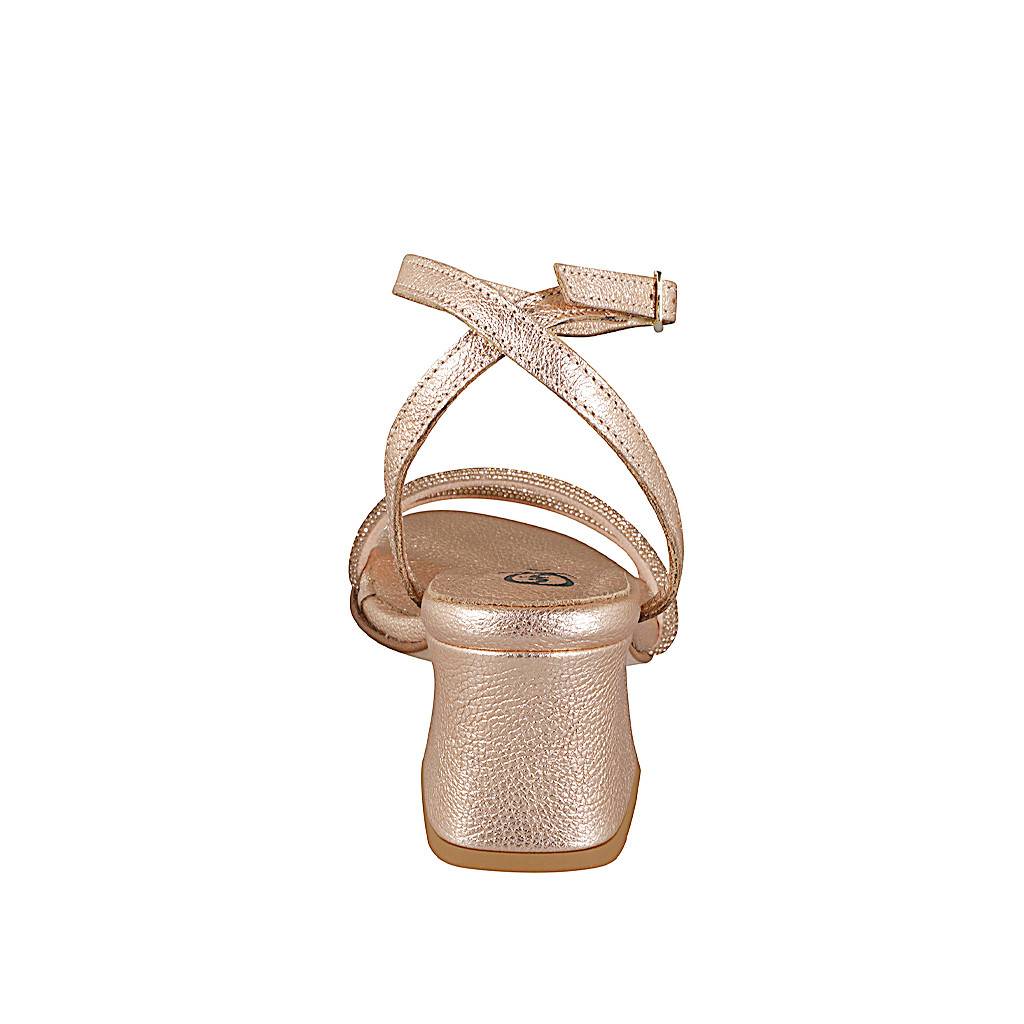 Sandales pour femmes avec courroie à la cheville en cuir lamé or rosé et lanières avec strass or et talon 6