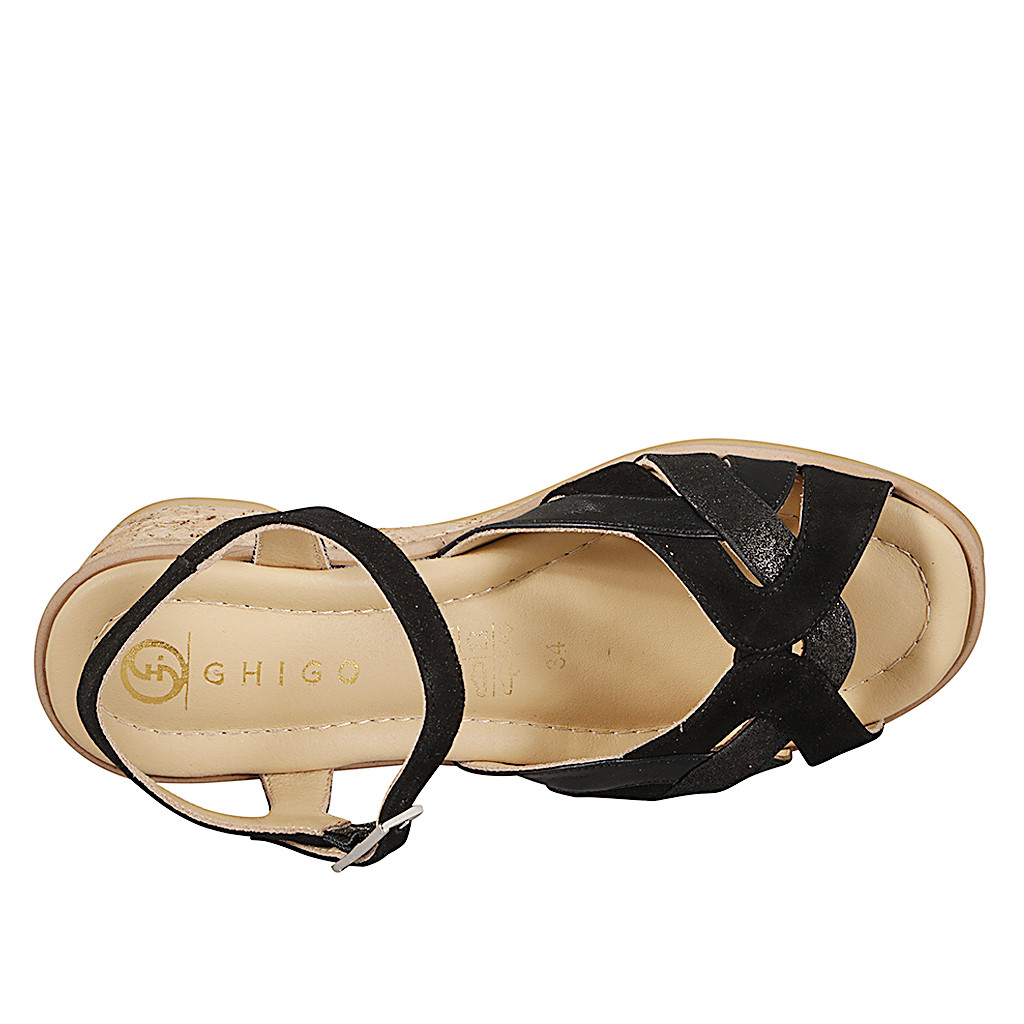 Sandales pour femmes avec semelle intérieure en mousse à mémoire de forme, en daim et cuir noir et gris, liège talon compensé 5