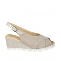 Sandales pour femmes avec semelle intérieure en mousse à mémoire de forme en daim beige et cuir lamé platine et talon compensé 6