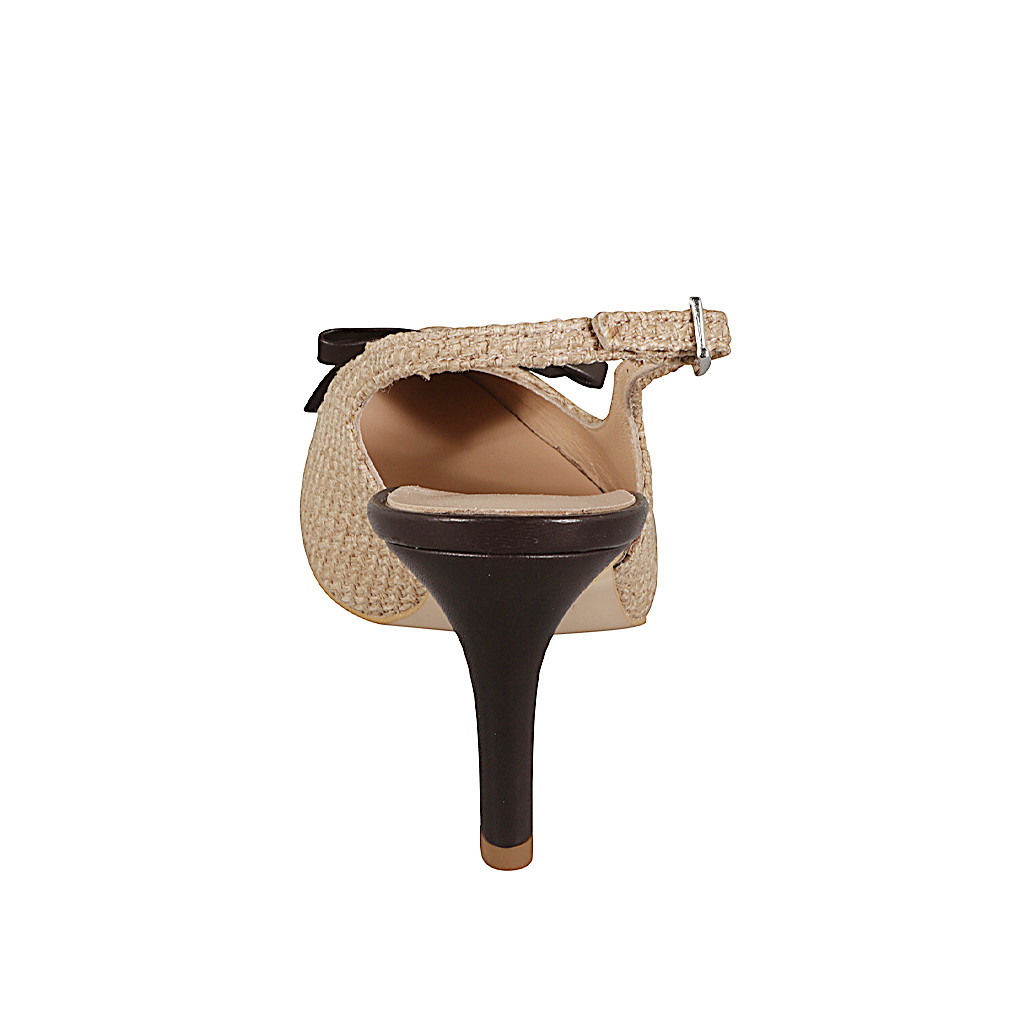 Slingback pour femmes à bout en tissu beige et cuir marron foncé avec nœud talon 9