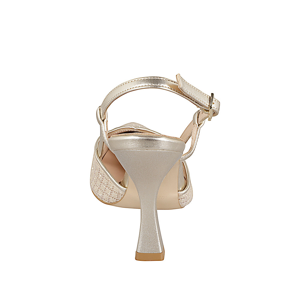 Slingback à bout pointu pour femmes en tissu beige brillant et cuir laminé platine talon 9