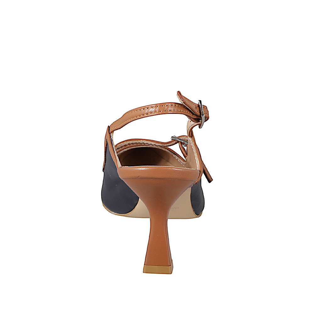 Slingback à bout pointu pour femmes modèle Mary Jane en cuir bleu foncé et bords en cuir cognac, talon 7