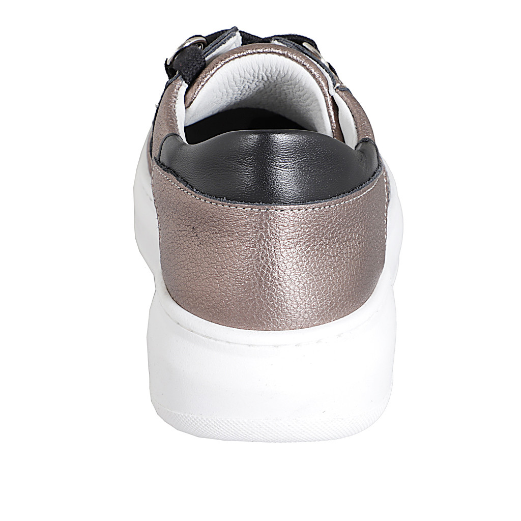 Chaussure à lacets en tissu perforé, daim et cuir lamé et imprimé platine talon compensé 3