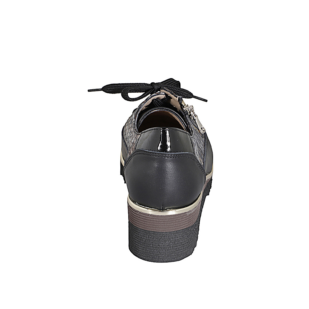 Chaussure pour femmes à lacets avec fermeture éclair en cuir et daim bleu clair y cuir lamé argent talon compensé 4