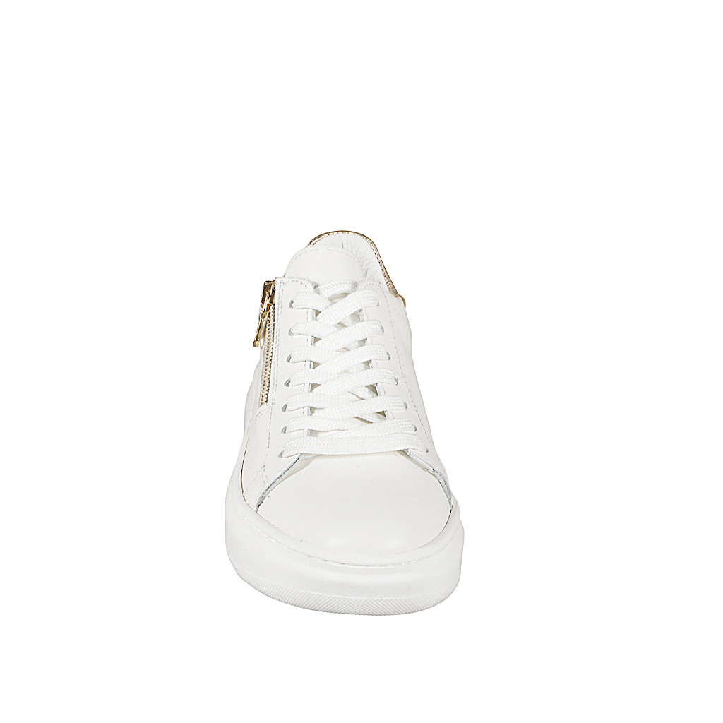 Chaussure pour femmes à lacets avec semelle amovible et fermeture éclair en cuir blanc et lamé platine talon compensé 4