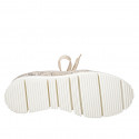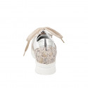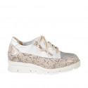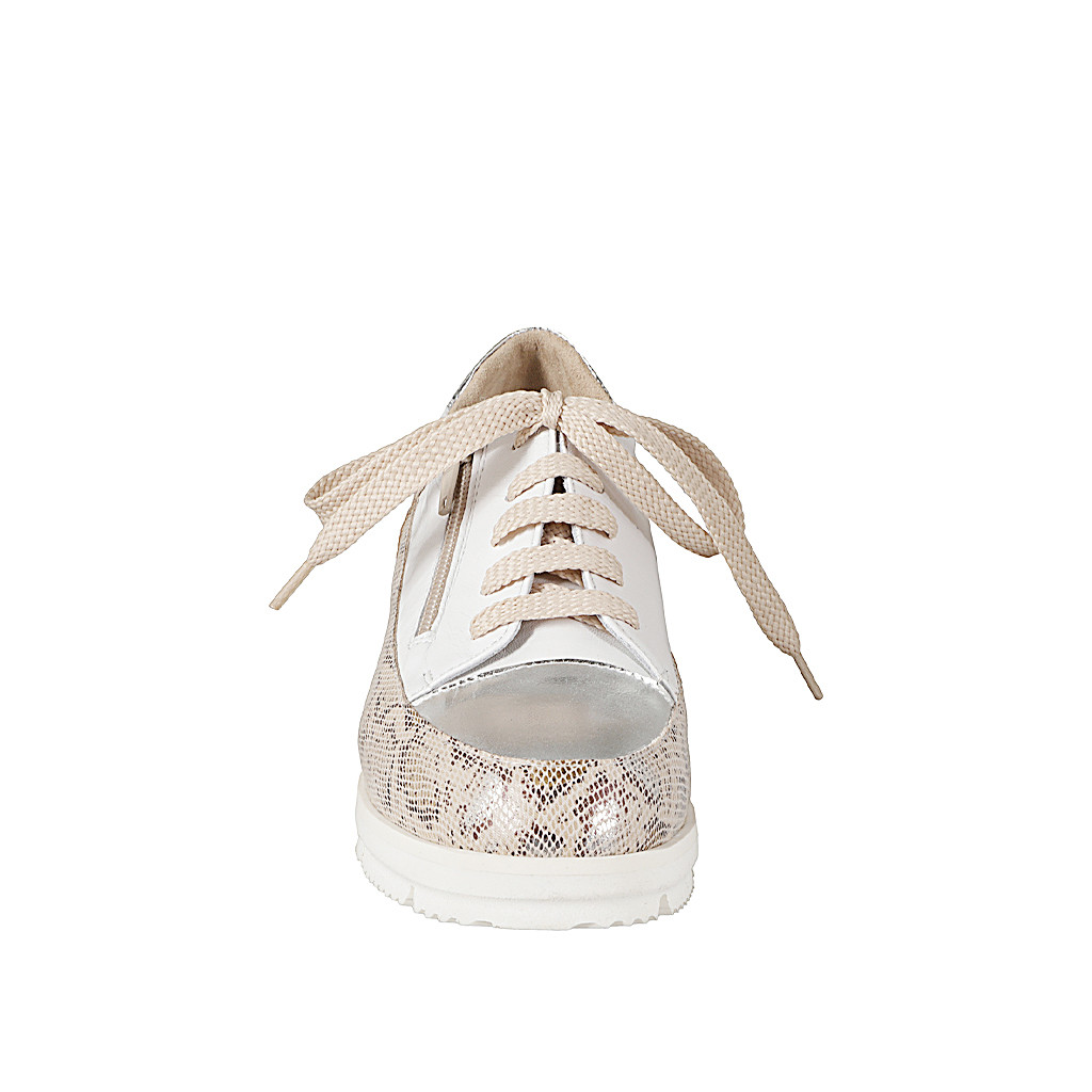 Sneaker pour femme avec lacets et semelle intérieure amovible en cuir blanc, imprimé et lamé argent, talon compensé 3
