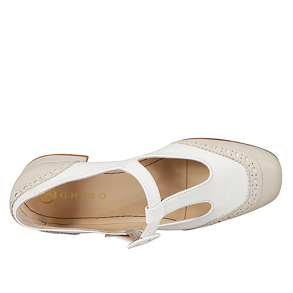 Ballerina con cinturino stile Charleston da donna, in pelle bianco con puntale e tallone in pelle color beige e tacco 3
