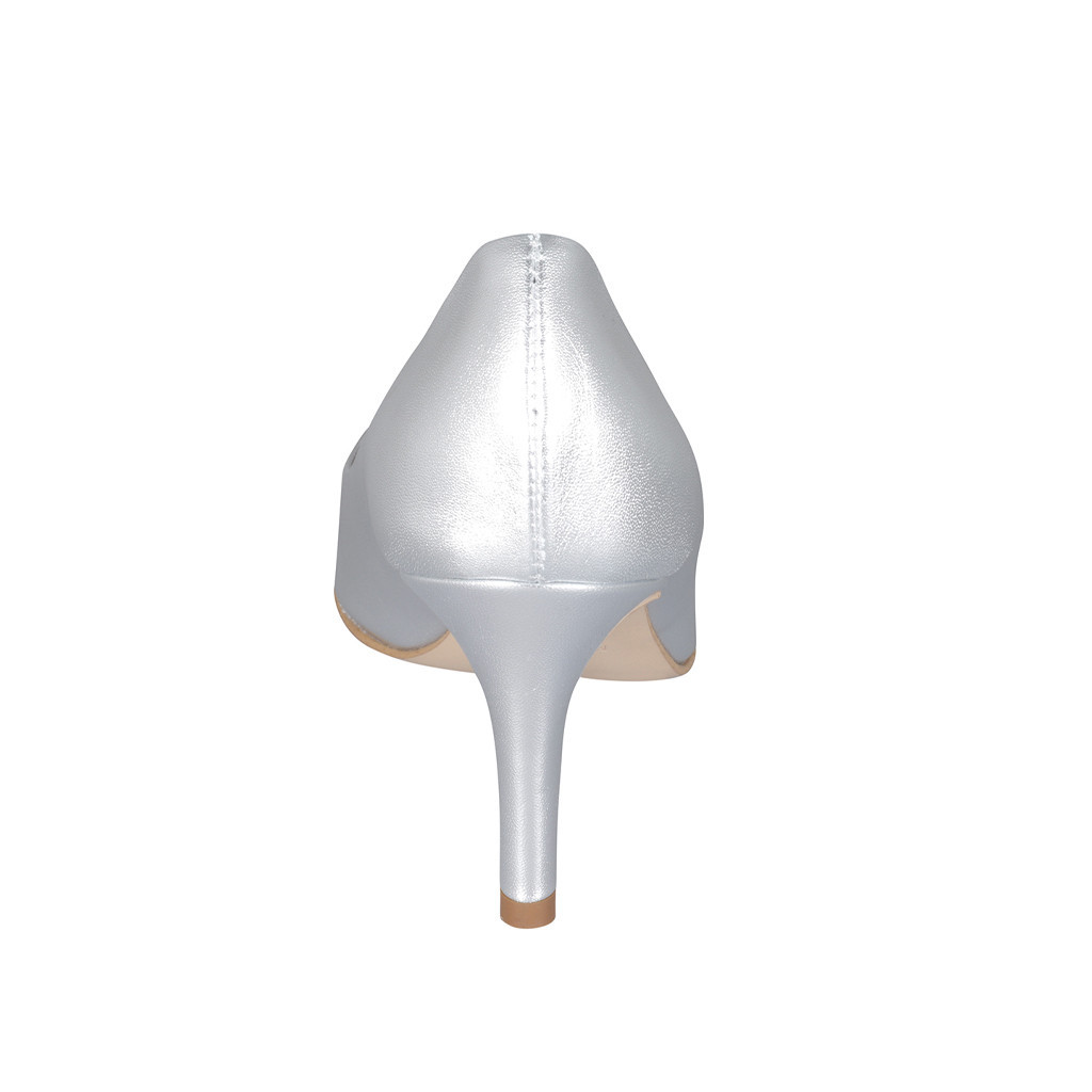 Décolleté a punta da donna in pelle laminata argento tacco 7