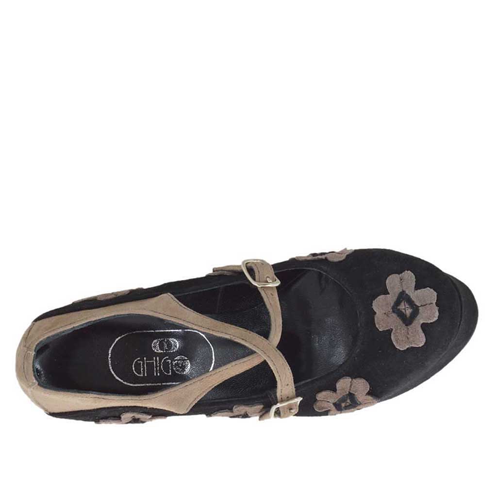 Decolté da donna con fiori, cinturini incrociati e plateau, altezza tacco cm. 15 con 4cm di plateau, in camoscio nero e taupe, fondo cuoio, fodera pelle. Disponibile nelle misure piccole e grandi.