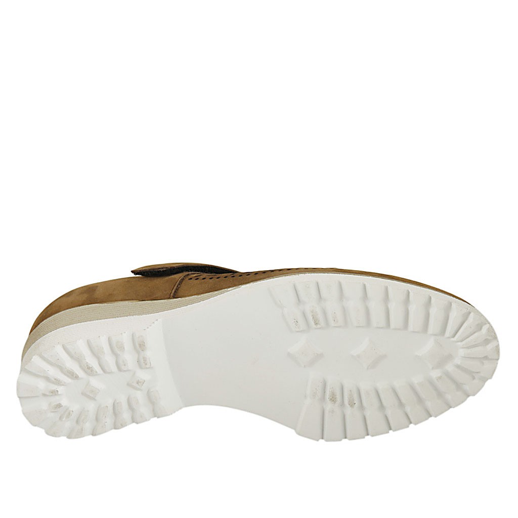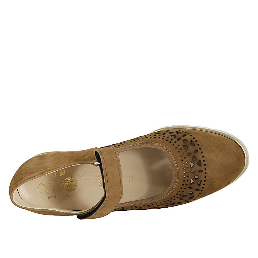 Décolleté da donna con velcro e plantare estraibile in camoscio forato color tabacco tacco 4