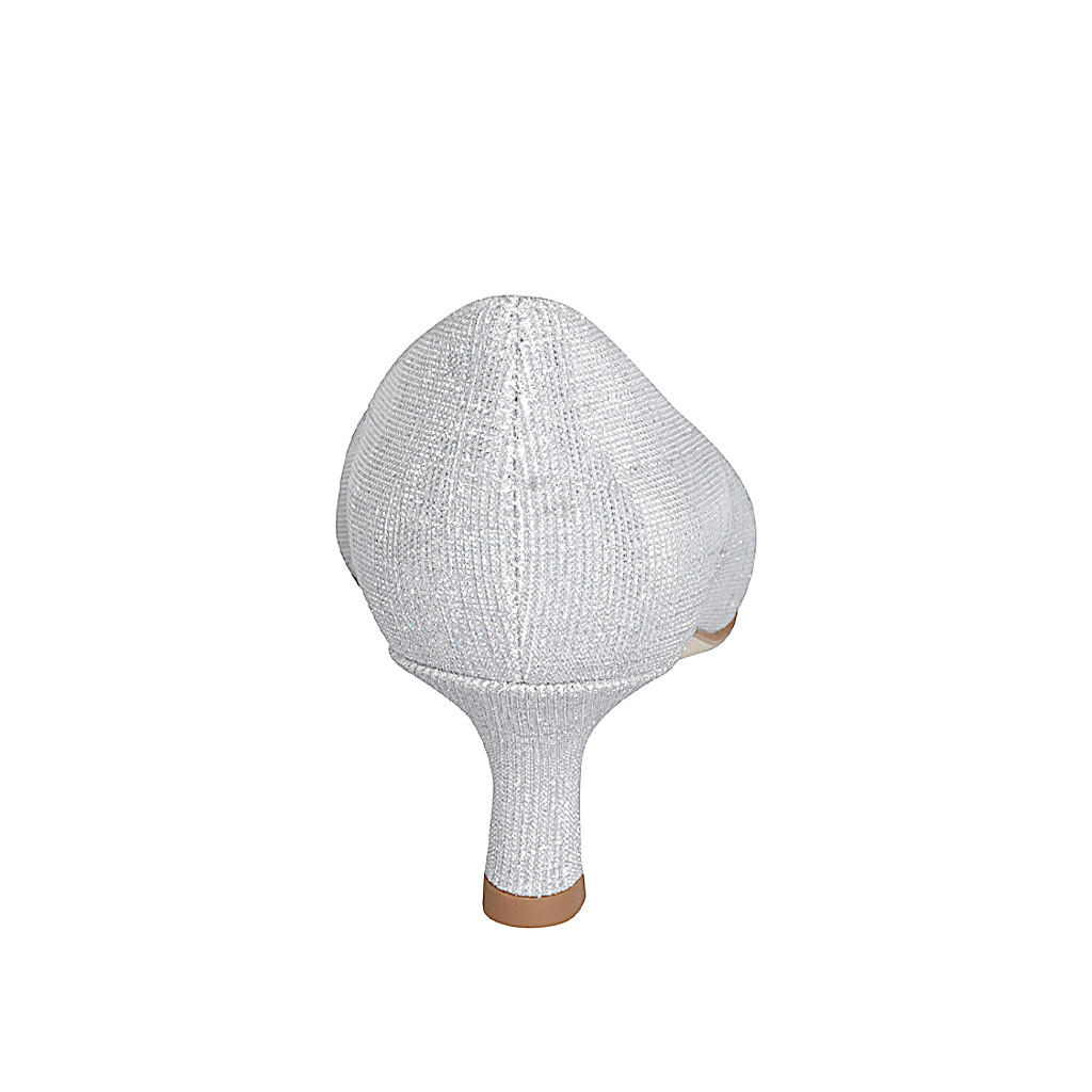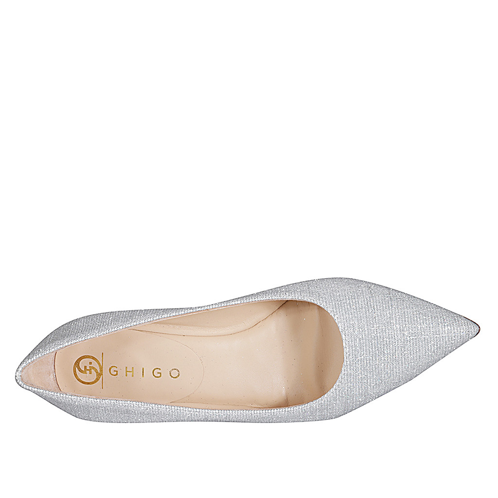Décolleté a punta da donna in tessuto laminato glitterata argento tacco 5