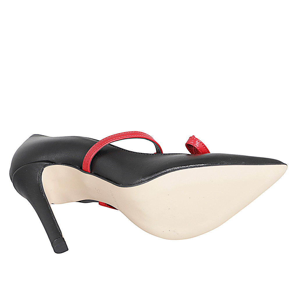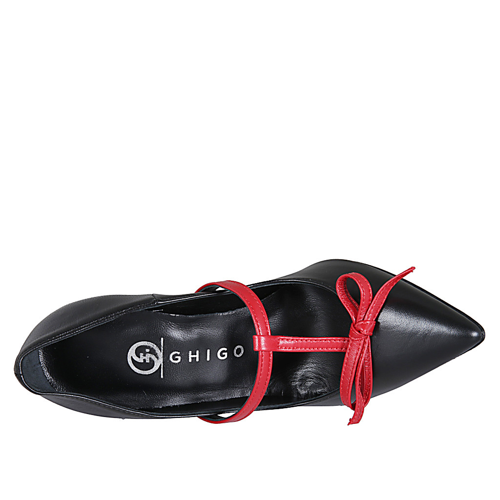 Décolleté da donna con cinturino e fiocco in pelle nera e rossa tacco 10