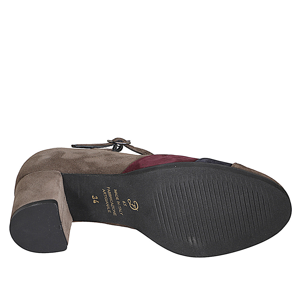 Decolté da donna in camoscio marrone, blu e bordeaux con cinturino Charleston e plantare estraibile tacco 5