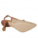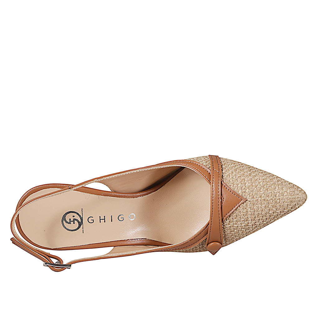 Slingback da donna in tessuto corda beige con bottone e profili in pelle cuoio tacco 7