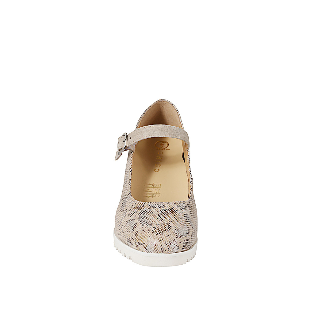 Decolté da donna con plantare estraibile e cinturino, in pelle stampata e camoscio beige con zeppa 6