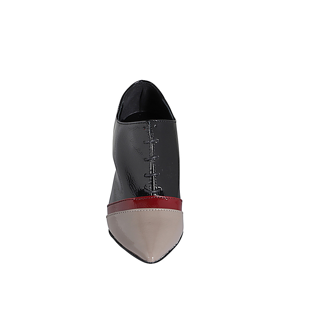Scarpa stringata a punta in vernice nera, beige e bordeaux tacco 7