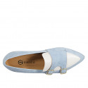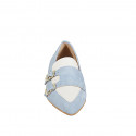 Mocassino da donna a punta con doppia fibbia in camoscio effetto denim e pelle bianca, tacco 2