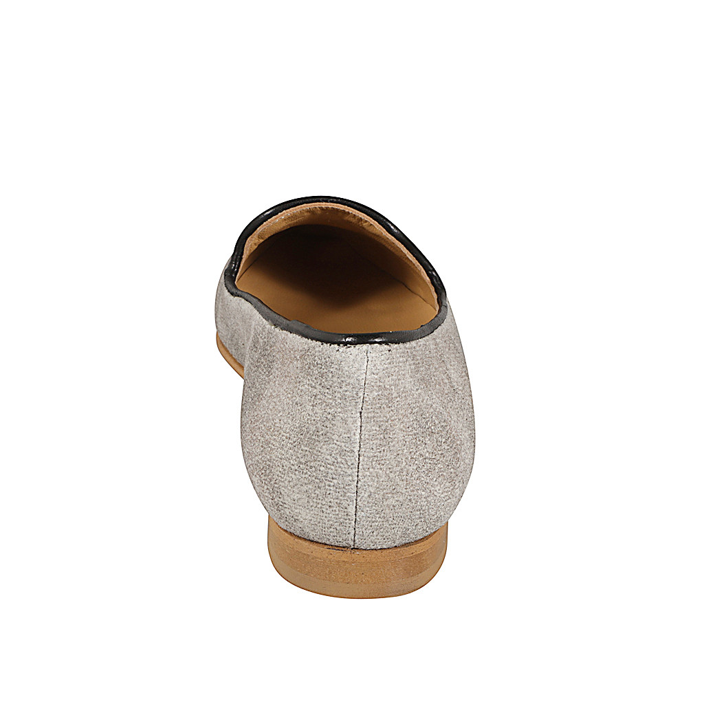 Mocassino a punta da donna in camoscio kaki effetto jeans e bordo in pelle nero, tacco 2