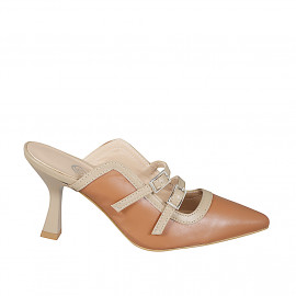Sandalo da donna con cinturino alla caviglia in pelle cuoio e tessuto bouclé multicolore con tacco 5