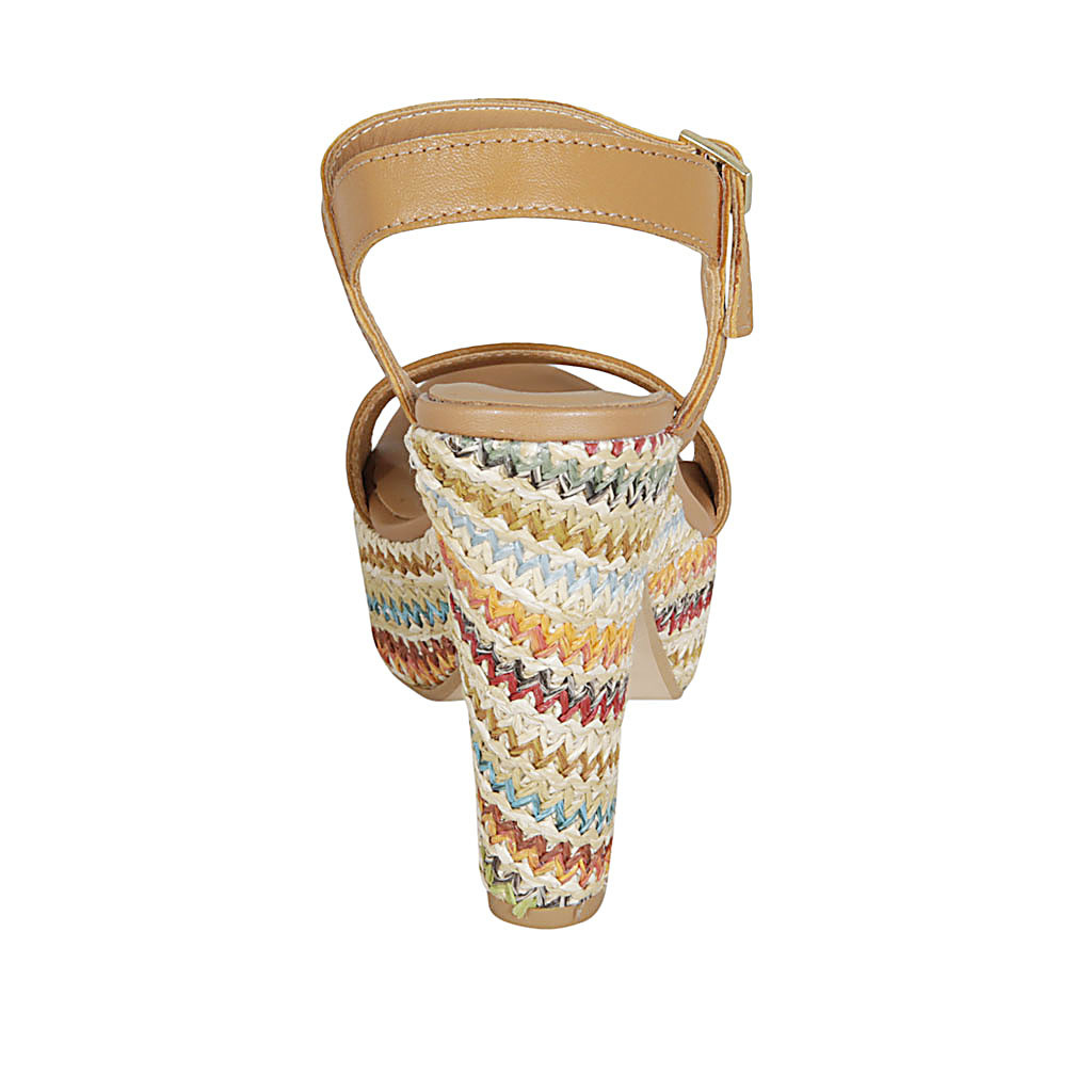 Sandalo da donna con cinturino e plateau in pelle color cuoio e tessuto multicolore tacco 12