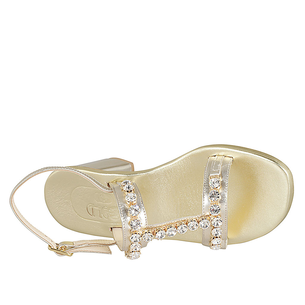 Sandalo da donna con strass di cristalli dorati in pelle laminata platino tacco 6 - Misure disponibili: 42, 45