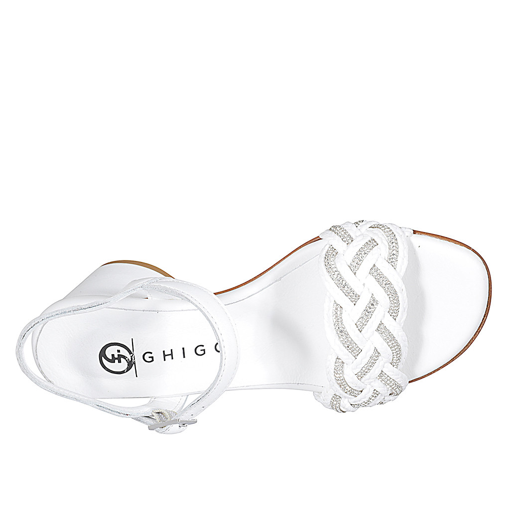 Sandalo da donna in pelle e rafia bianca con cinturino alla caviglia e strass tacco 5