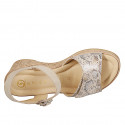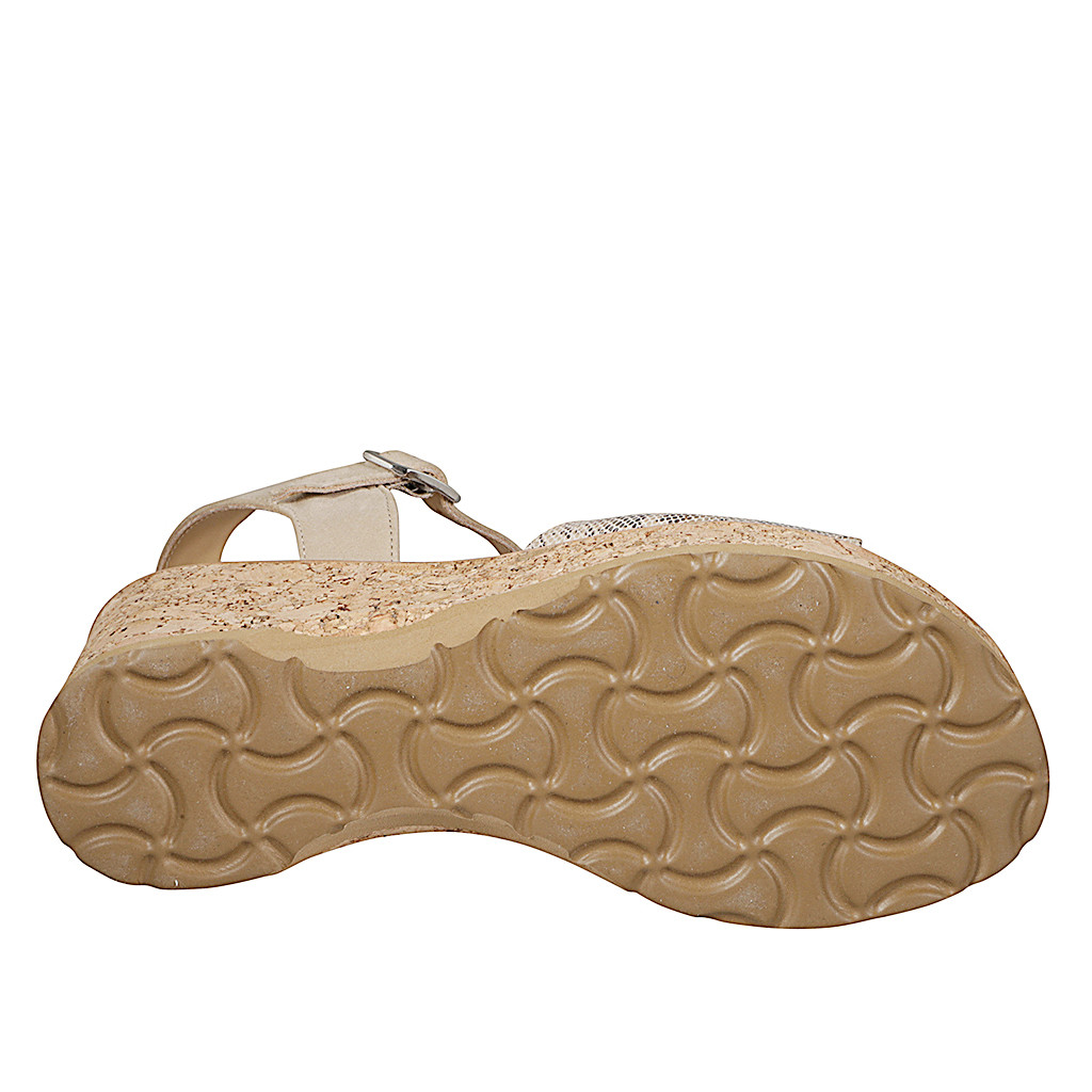 Sandalo da donna con fascia con velcro e plantare in memory foam, in camoscio beige e pelle stampata, zeppa in sughero alta 7
