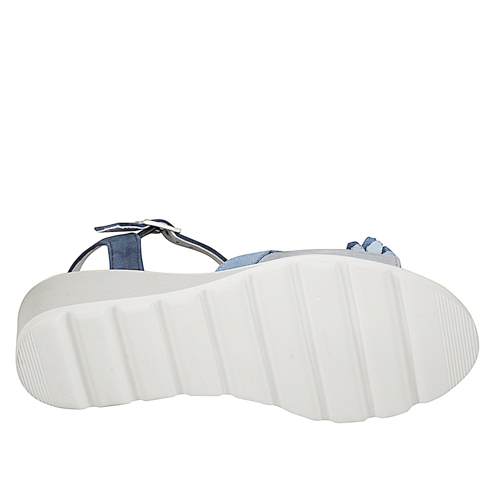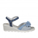 Sandalo da donna con plantare in memory foam e decorazione floreale, in camoscio blu, avio e celeste, zeppa 5