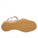 Sandalo da donna con plantare in memory foam e listini incrociati, in pelle bianca, taupe e cuoio, zeppa in sughero 5