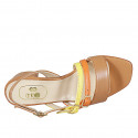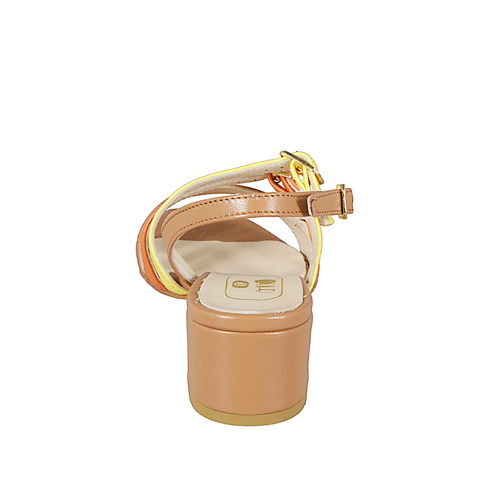 Sandalo da donna con doppio cinturino trasversale in pelle cuoio, giallo e arancione con tacco 4