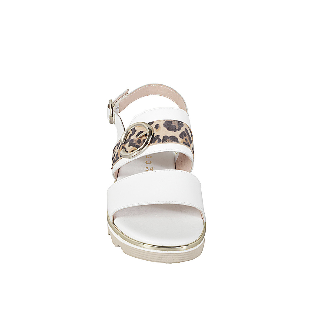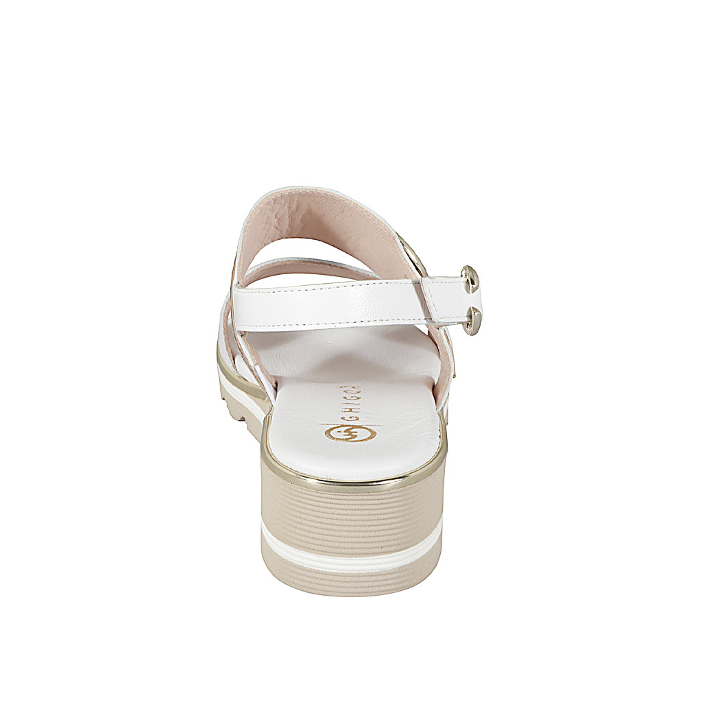 Sandalo da donna a 2 fasce con fibbia in pelle laminata platino e con zeppa 4