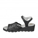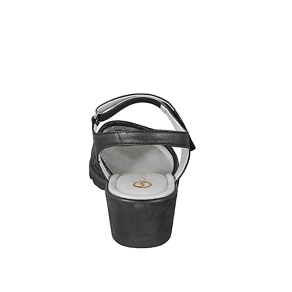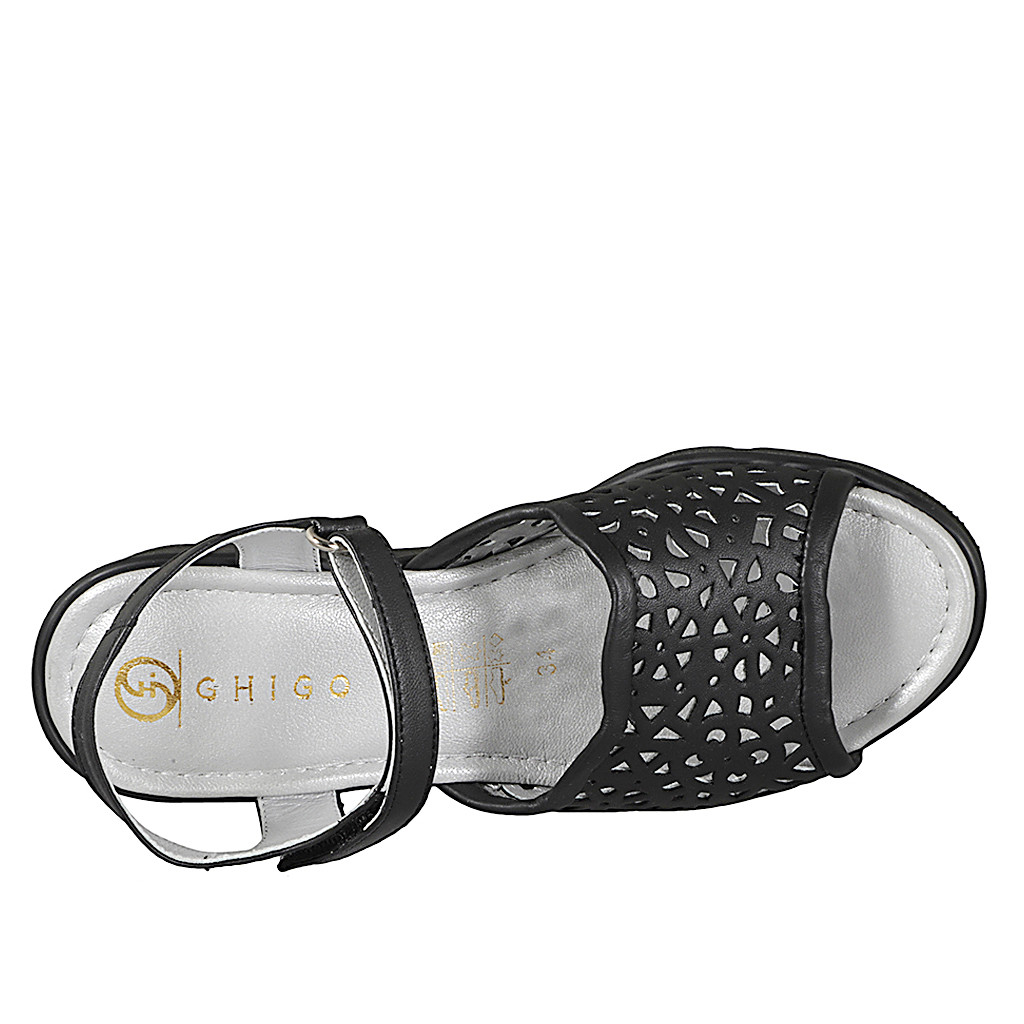 Sandalo da donna con plantare in memory foam e cinturino con velcro, in pelle traforata nera, zeppa 5