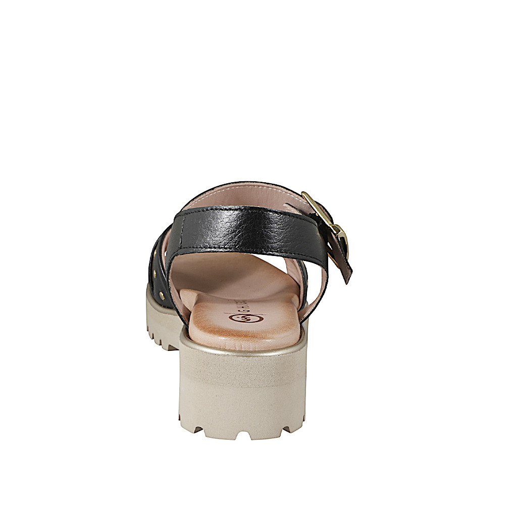Sandalo da donna con fascia incrociata decorata con borchie dorate in pelle nera, suola a carrarmato e tacco 4