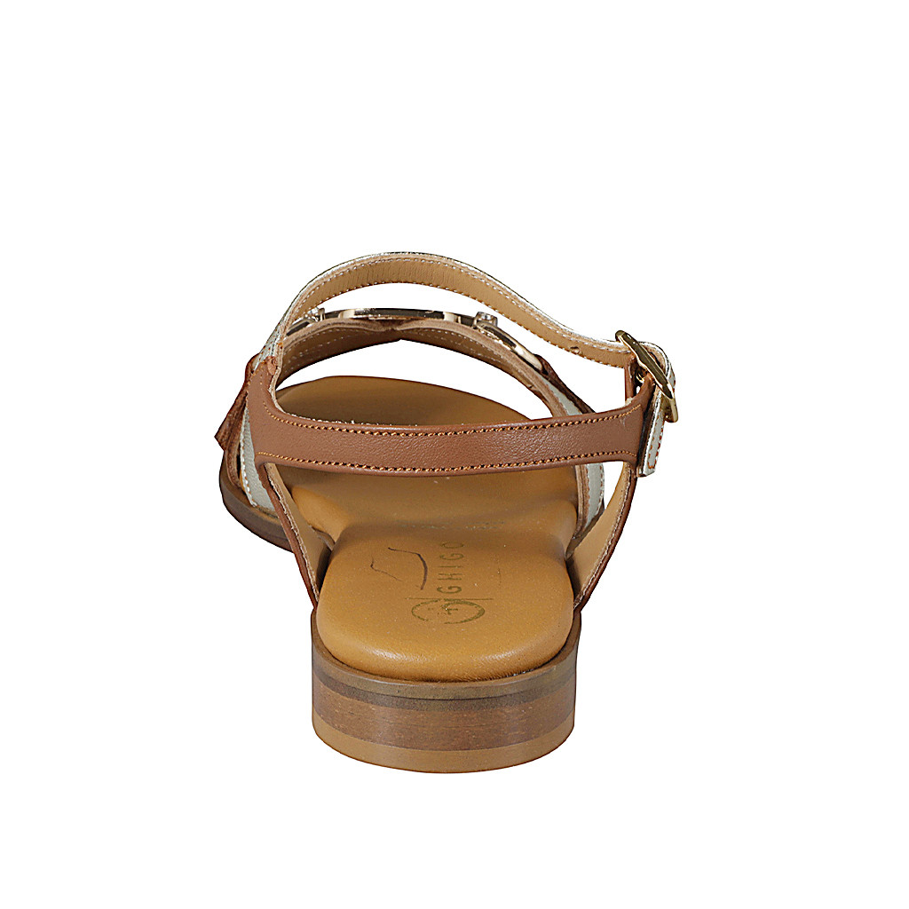 Sandalo da donna con accessorio con strass, in pelle laminata cuoio e platino e con tacco 2 - Misure disponibili: 32, 33, 34, 42, 43, 44, 45, 46