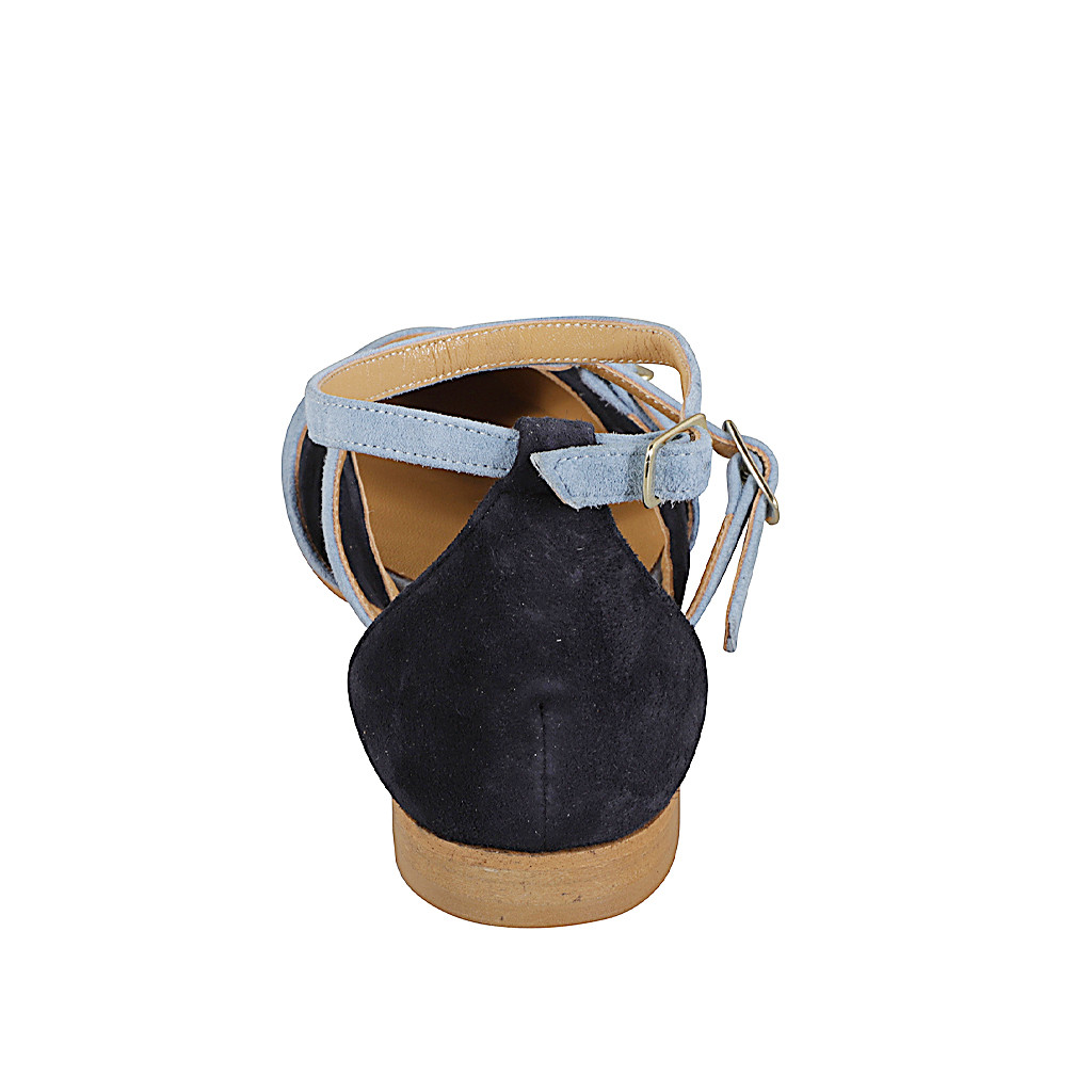 Scarpa aperta a punta da donna con 3 cinturini in camoscio blu scuro e celeste, tacco 2