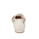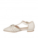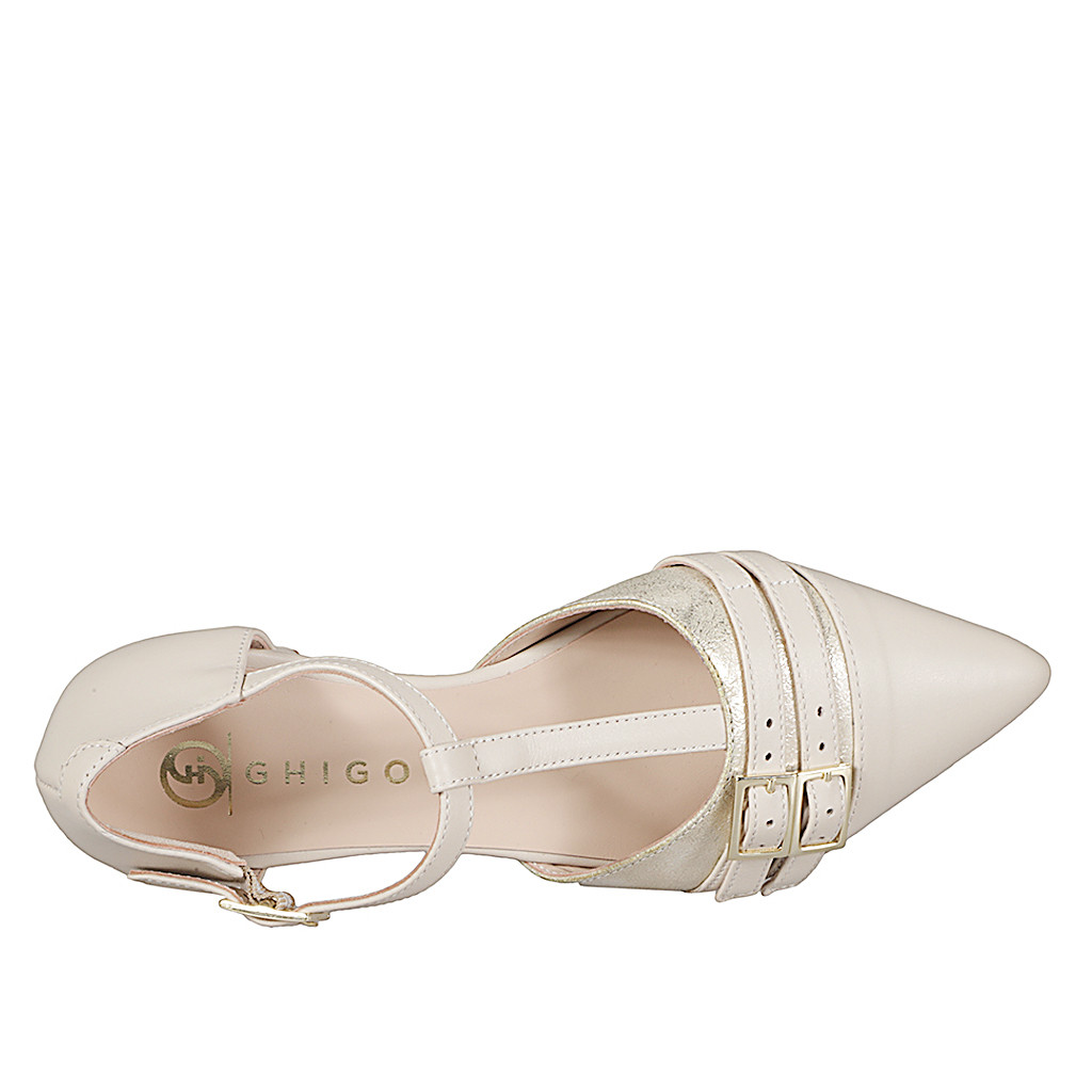 Scarpa aperta a punta con cinturino a Charleston e fibbie, in pelle beige chiaro e pelle laminata platino tacco 2