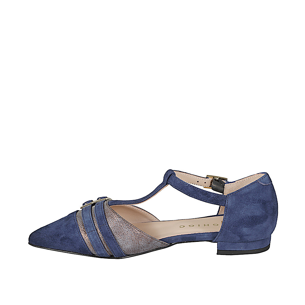 Scarpa aperta a punta con cinturino a Charleston e fibbie, in camoscio blu e pelle laminata bronzo ossidato, tacco 2
