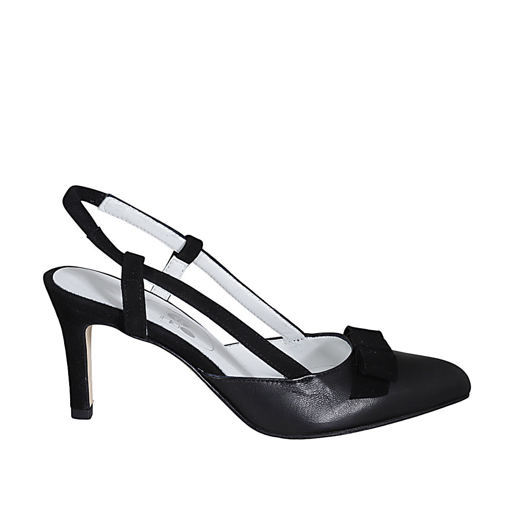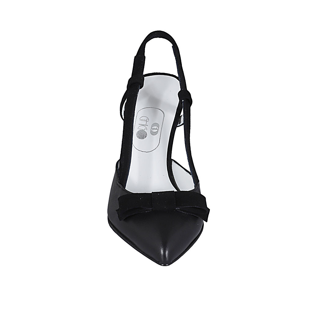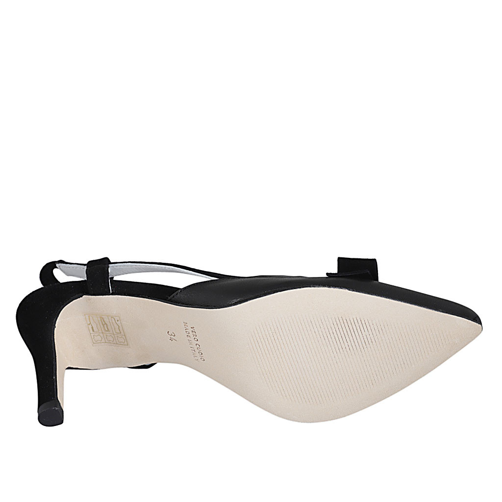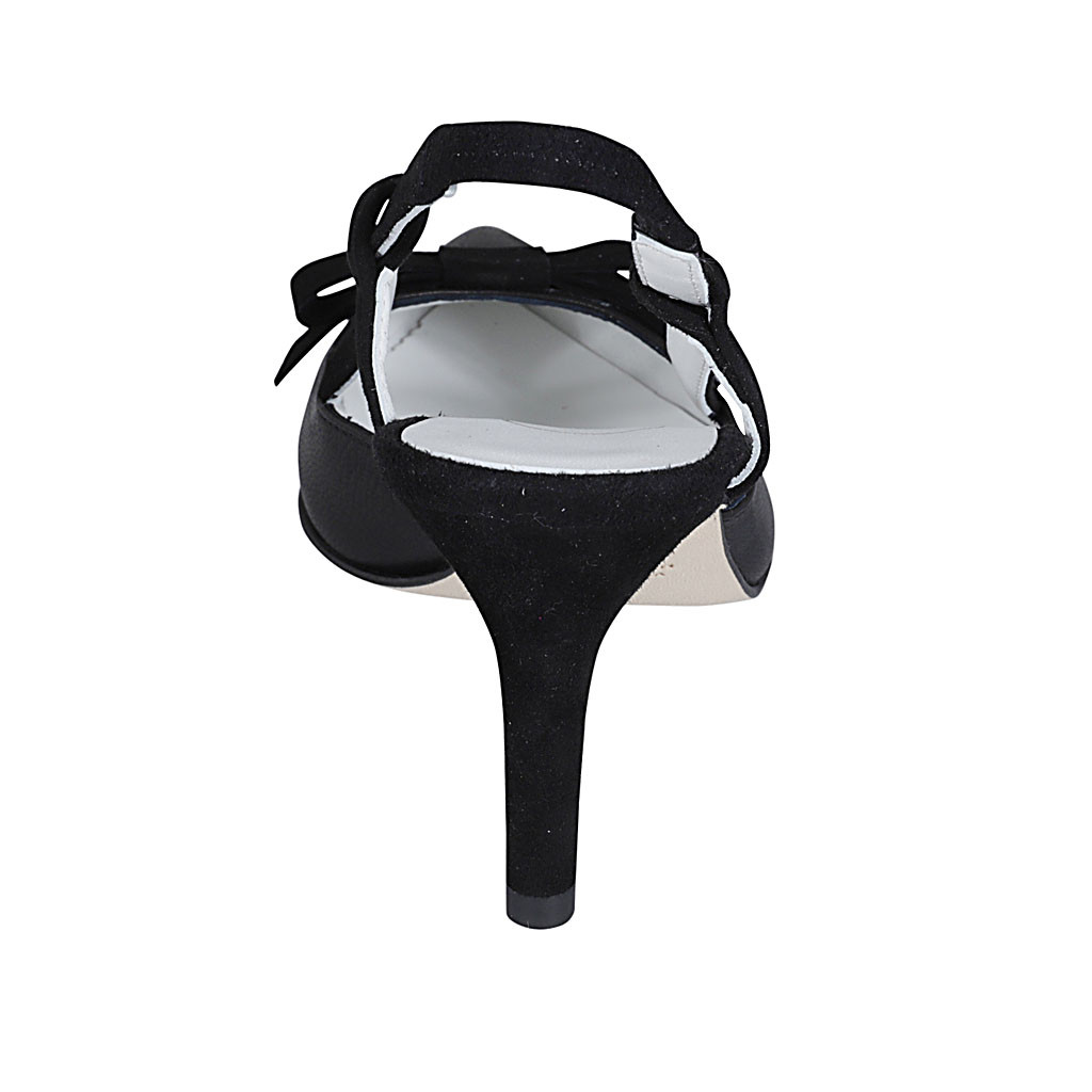 Décolleté aperta sul tallone da donna con elastico e fiocco in camoscio e pelle nera tacco 7