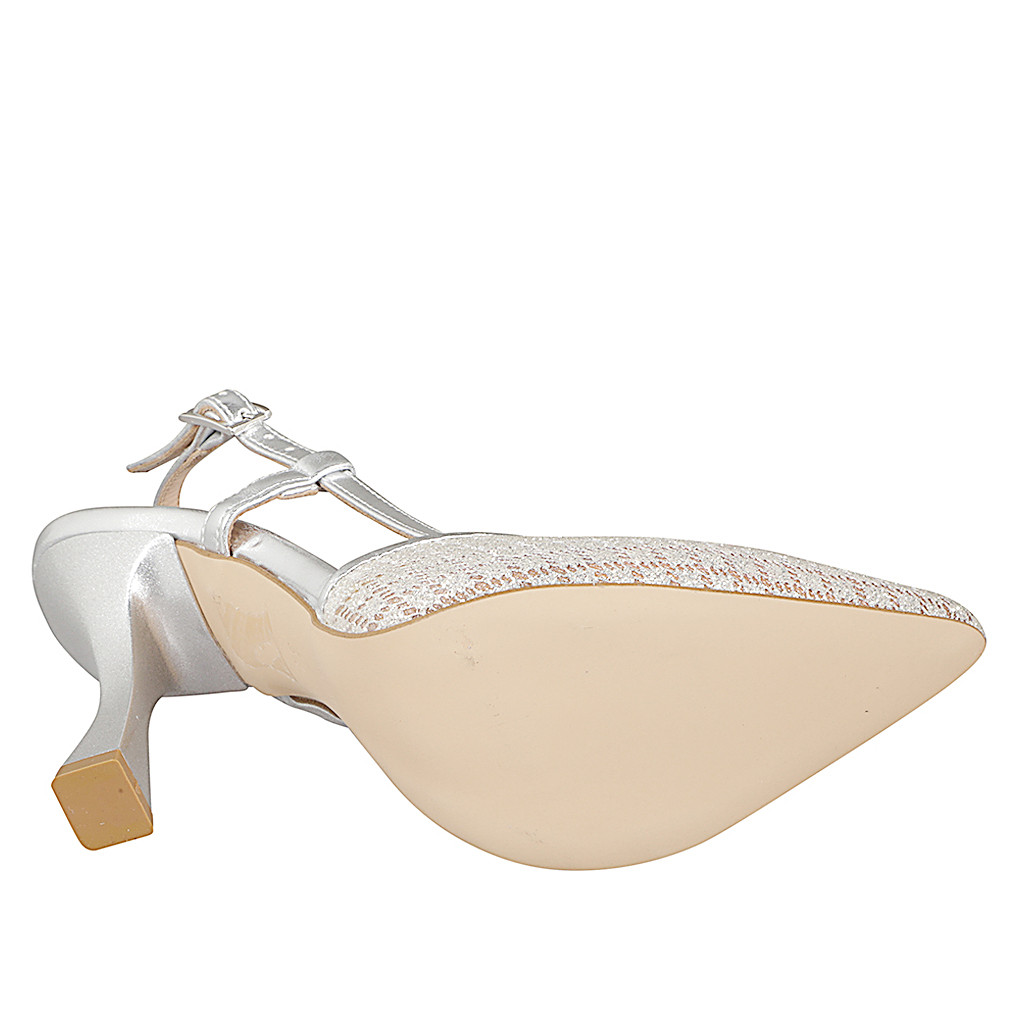 Slingback a punta da donna in tessuto argento brillante e pelle laminata argento tacco 9