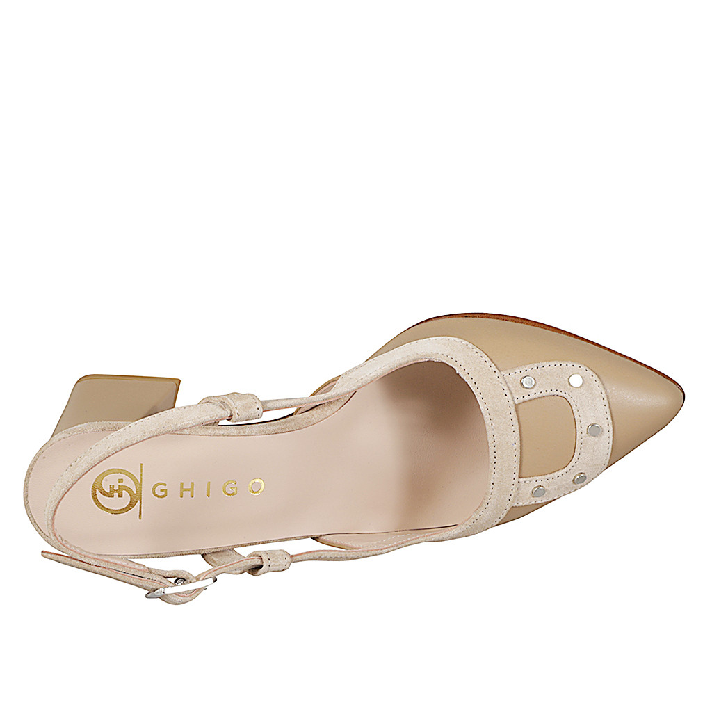 Slingback a punta da donna con borchie in pelle sabbia e camoscio beige con tacco 6
